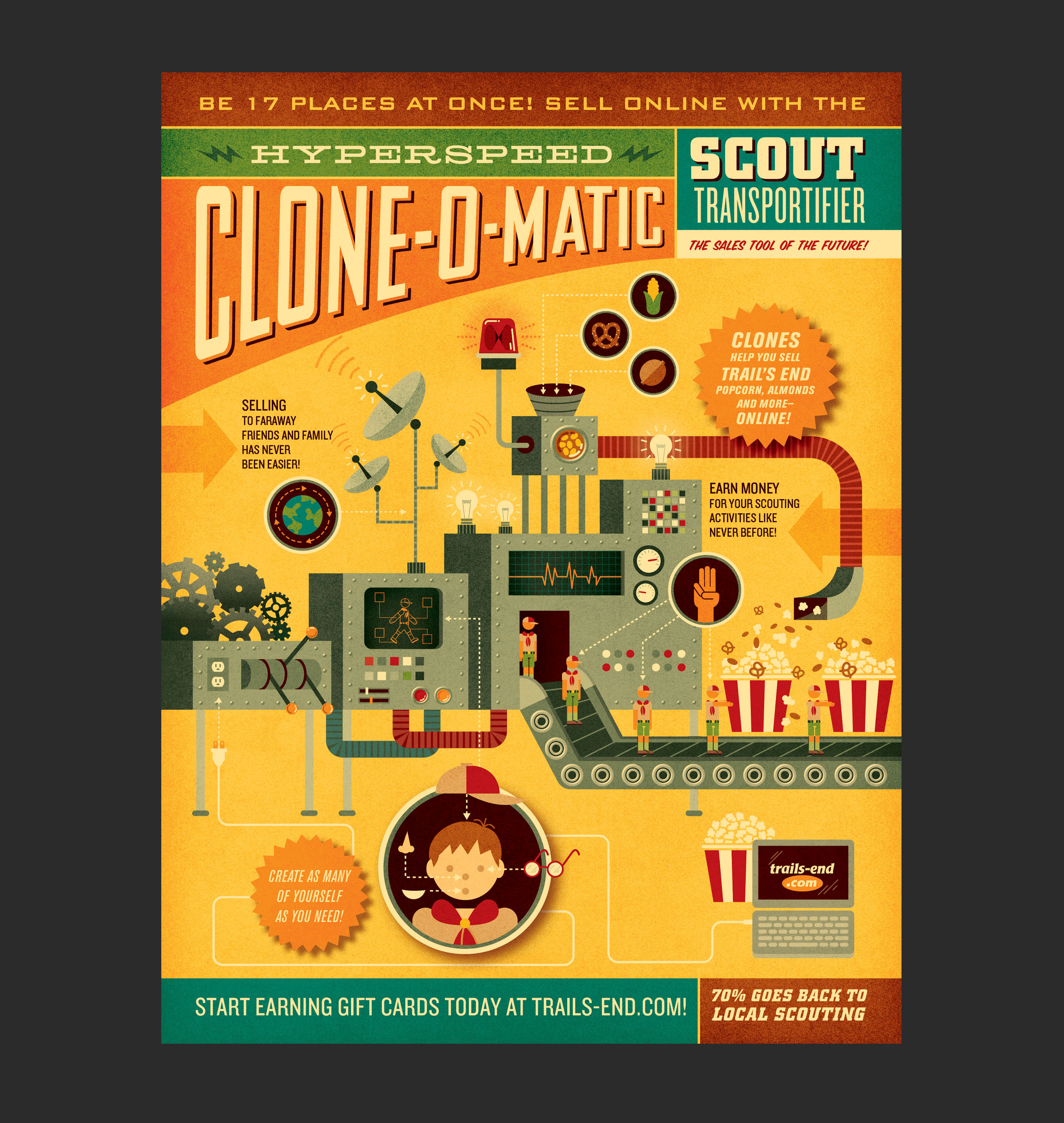For decades, the Cub Scouts and Boy Scouts have used Trail’s End Popcorn for fundraising. Rather than just being limited to selling door-to-door, a new Trail’s End website enables scouts to create online “clones” of themselves, making it easy to reach distant friends and family. We collaborated with Young & Laramore to create these ads promoting “the sales tool of the future!”