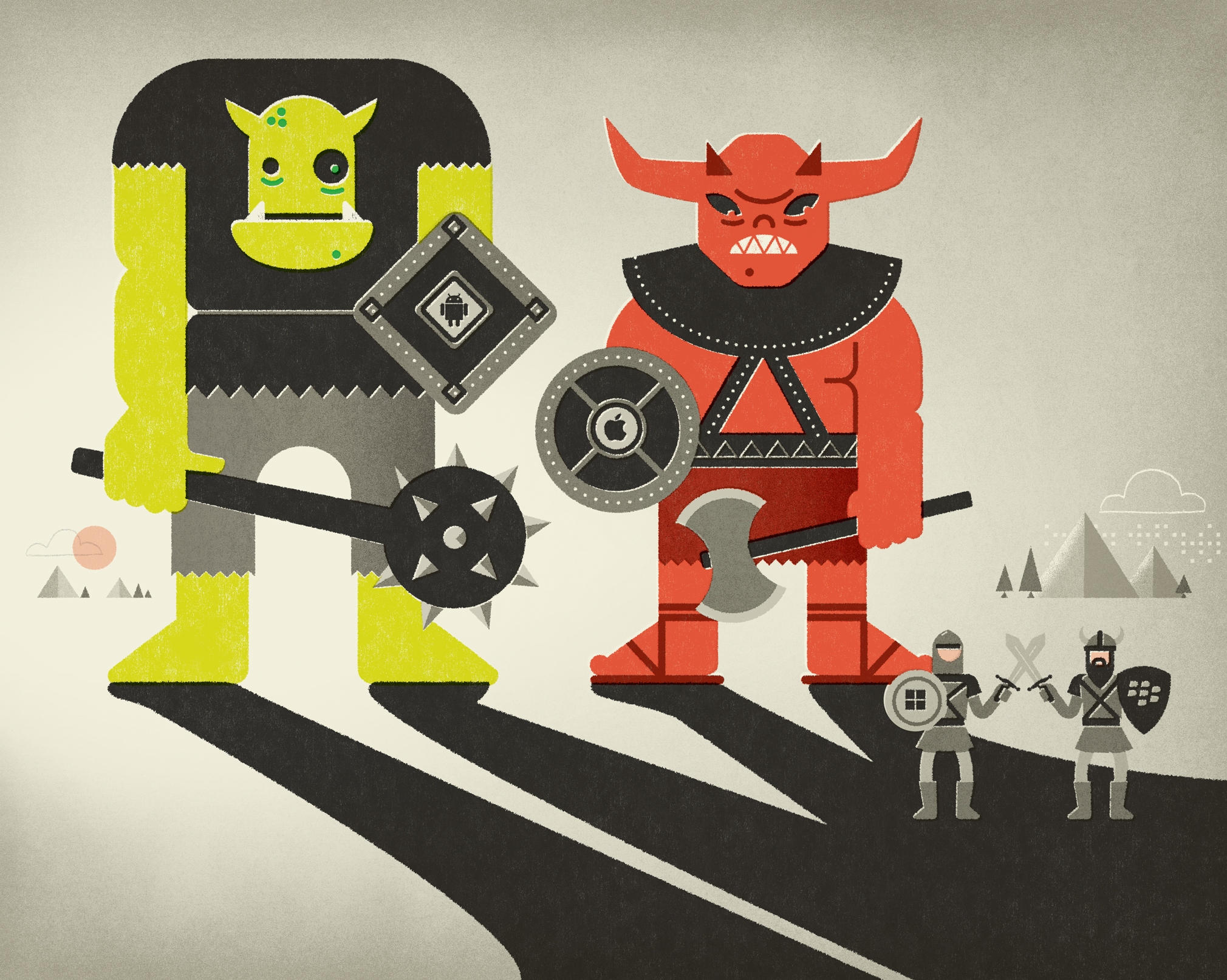 In the battle of the smart phones, Apple and Android tower over the competition, while Microsoft and RIM fight it out for third place. Apple and Android are depicted as giant creatures that cannot—short of a miracle—be defeated, with Microsoft and RIM brawling in their shadow.