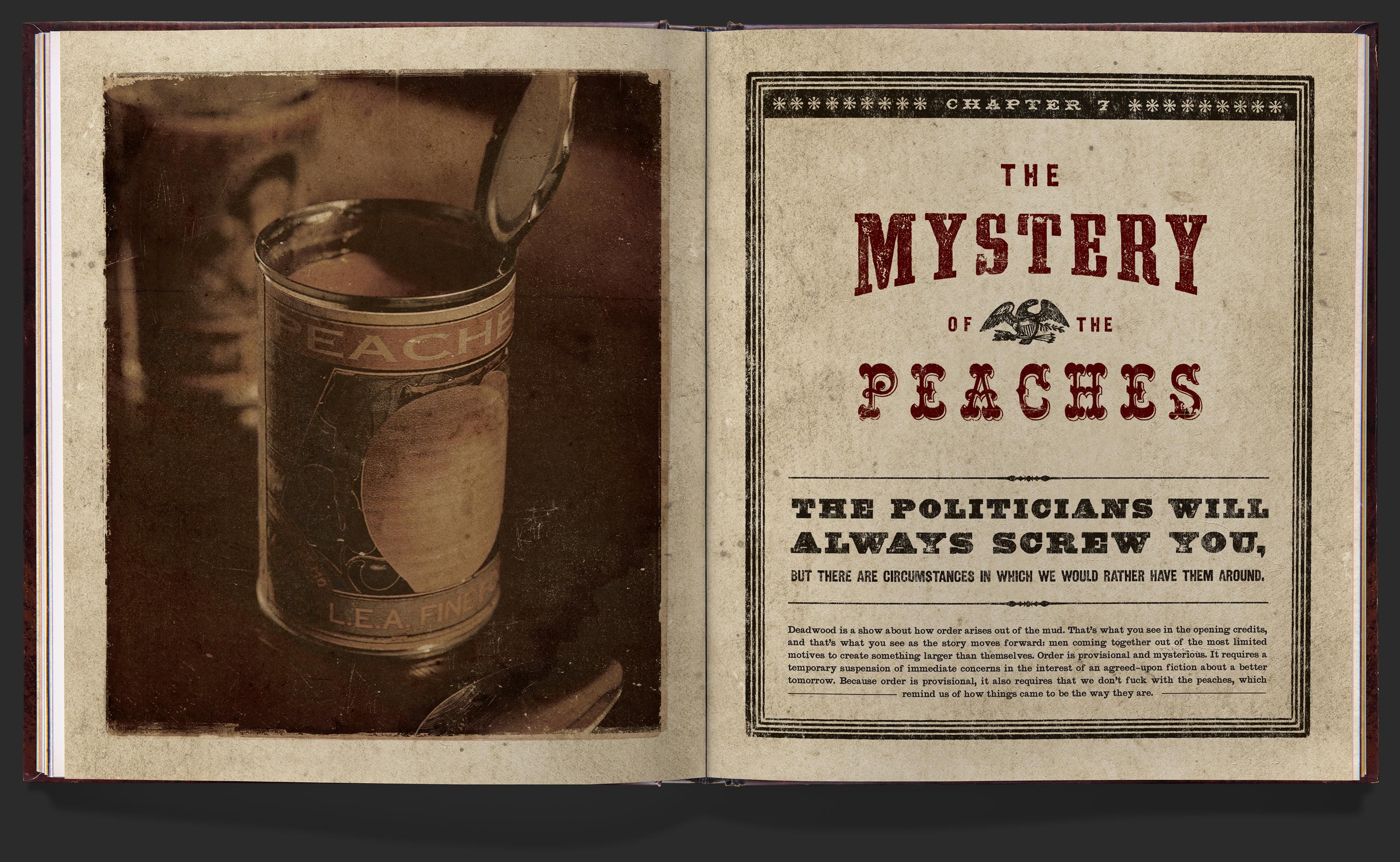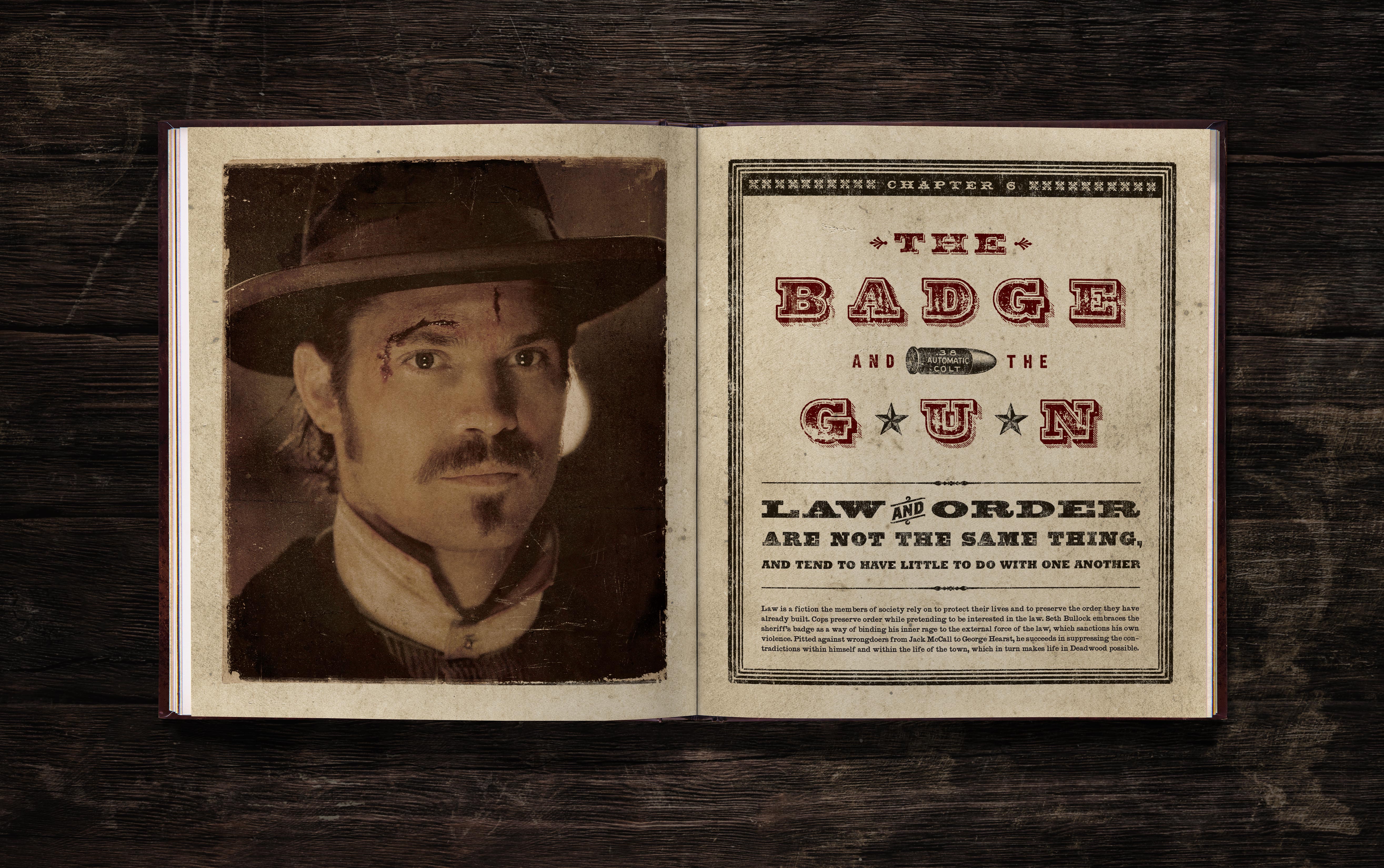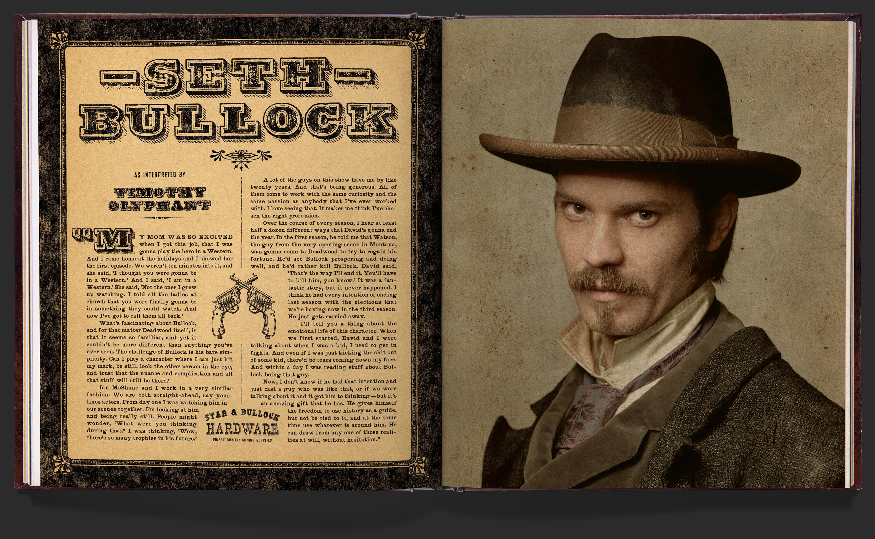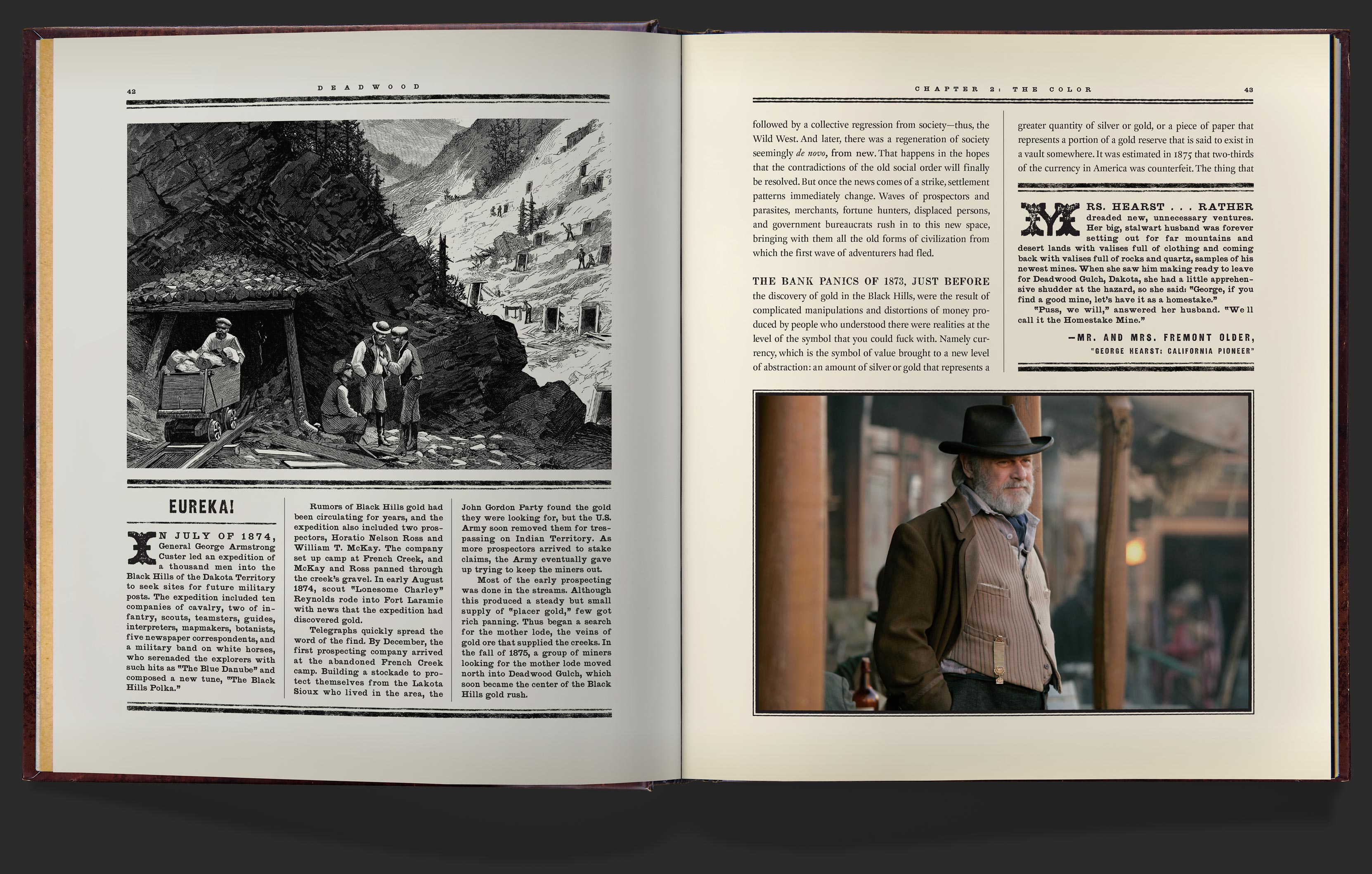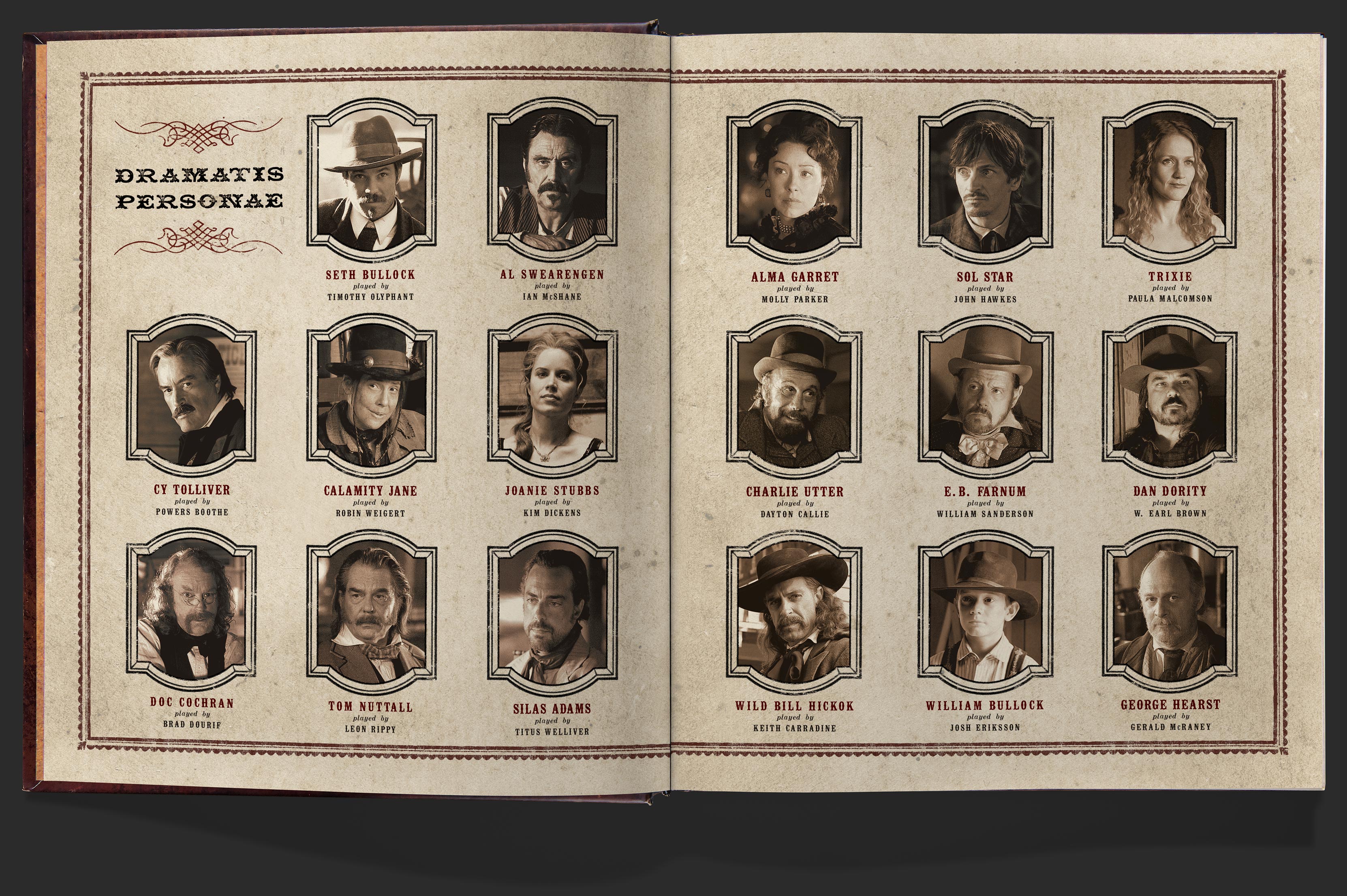 An official tie-in for HBO’s award-winning show Deadwood, this book provides insight into the making of the series and the historical figures who inspired it. We aimed for the design to reflect the beautifully intricate printed materials of America in the 1870s, along with the raw violence and rugged mayhem of the show. To achieve this, we incorporated historically authentic typography, aged and distressed photos, and even the occasional splattering of blood.