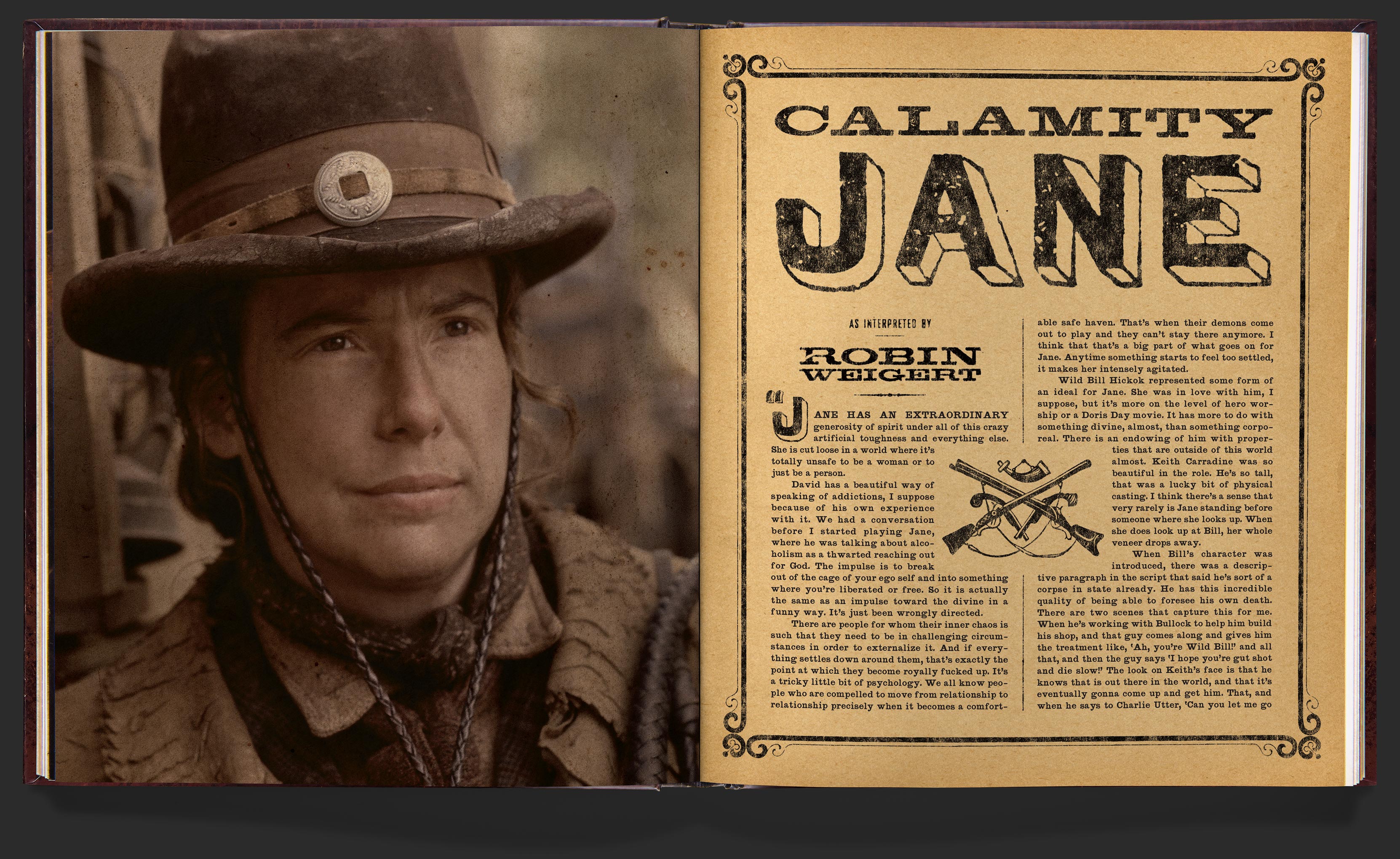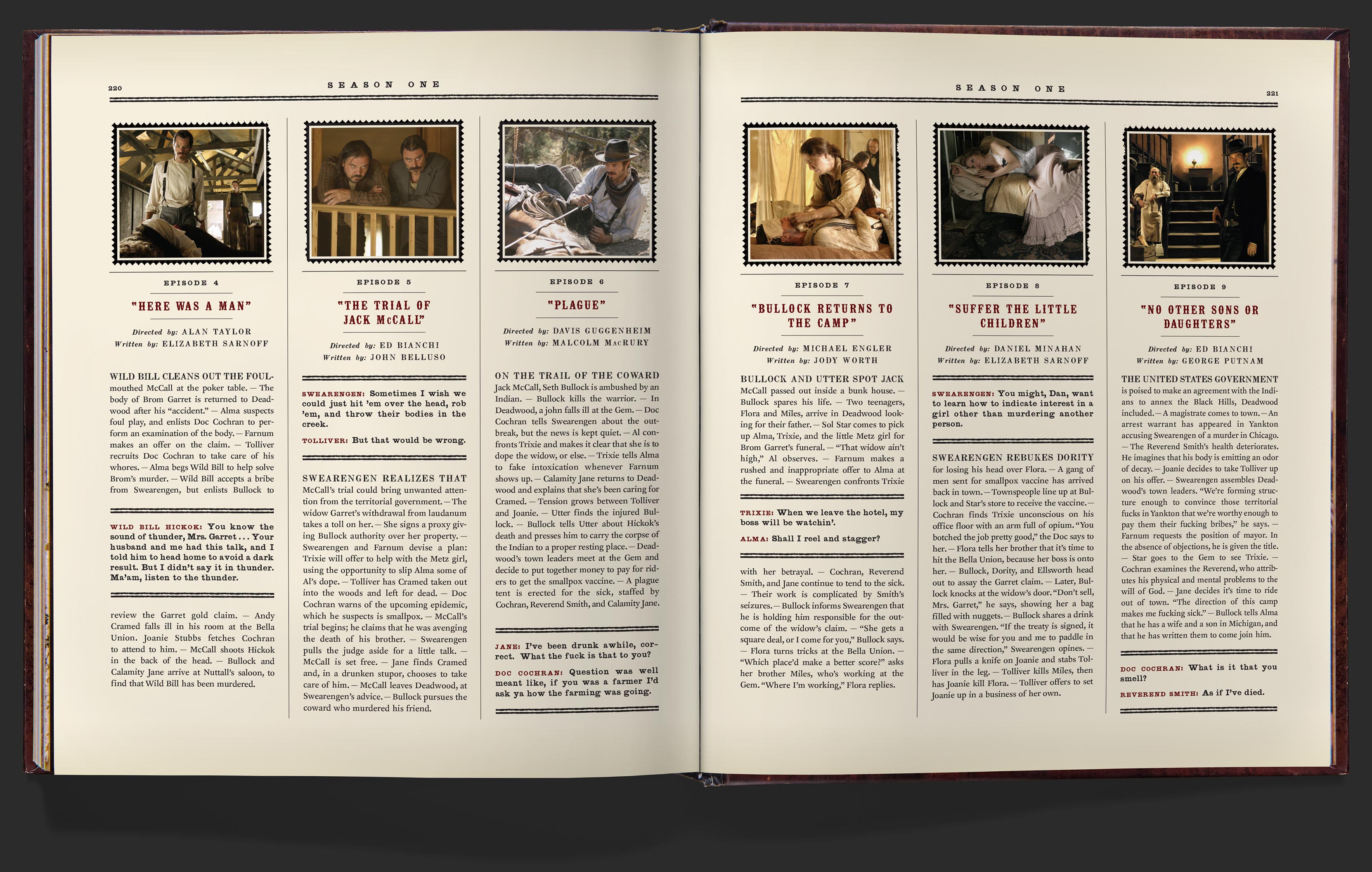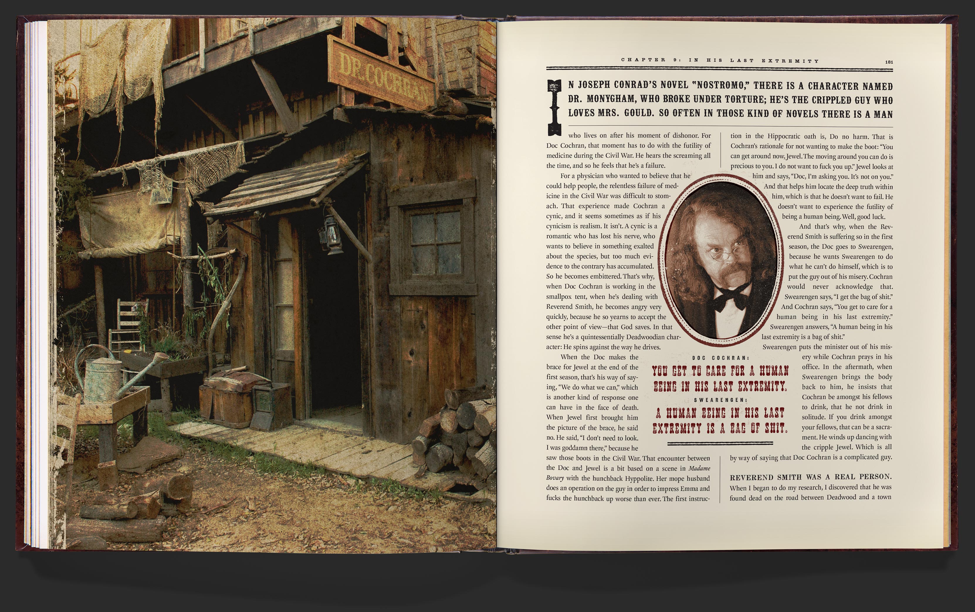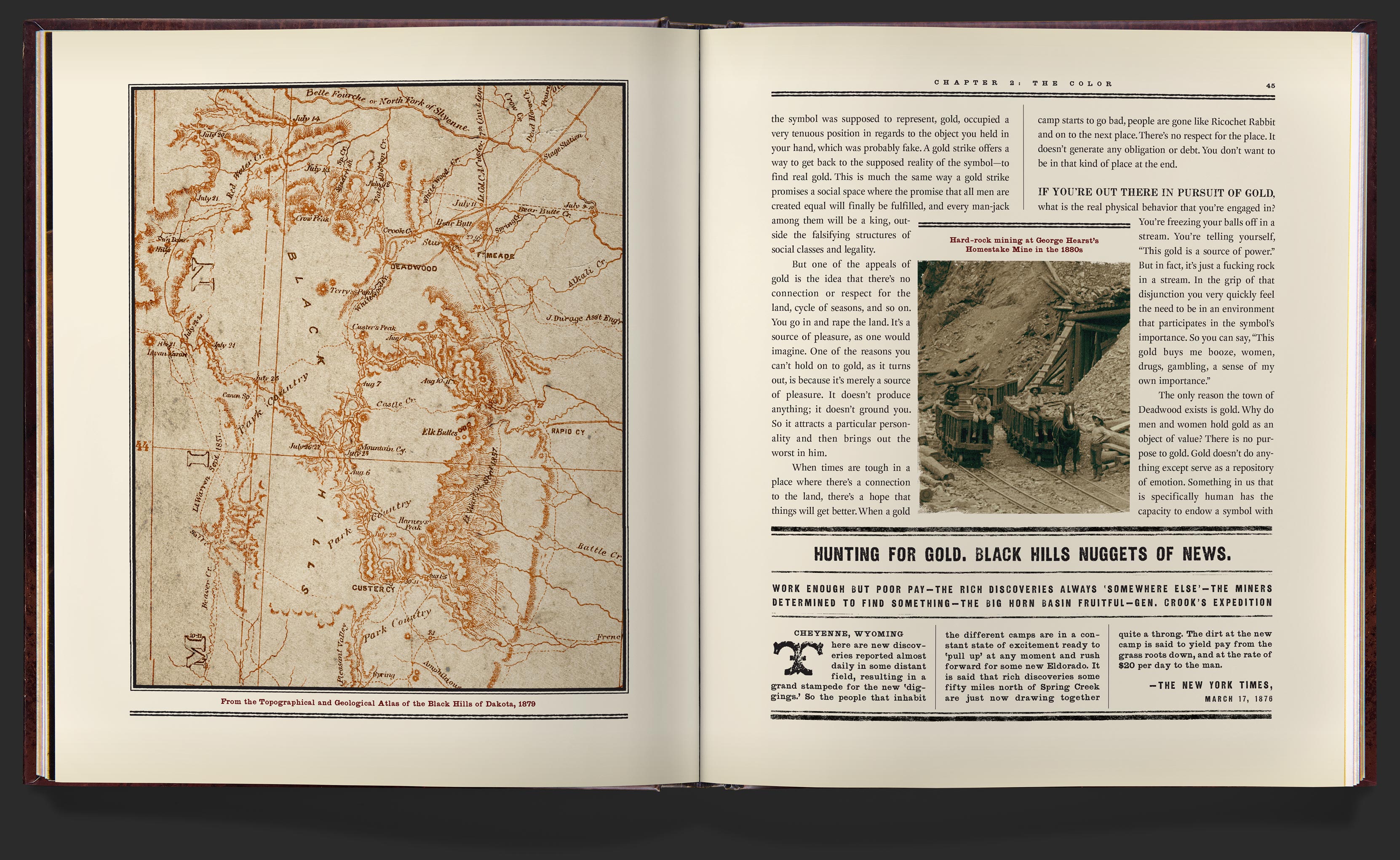 An official tie-in for HBO’s award-winning show Deadwood, this book provides insight into the making of the series and the historical figures who inspired it. We aimed for the design to reflect the beautifully intricate printed materials of America in the 1870s, along with the raw violence and rugged mayhem of the show. To achieve this, we incorporated historically authentic typography, aged and distressed photos, and even the occasional splattering of blood.