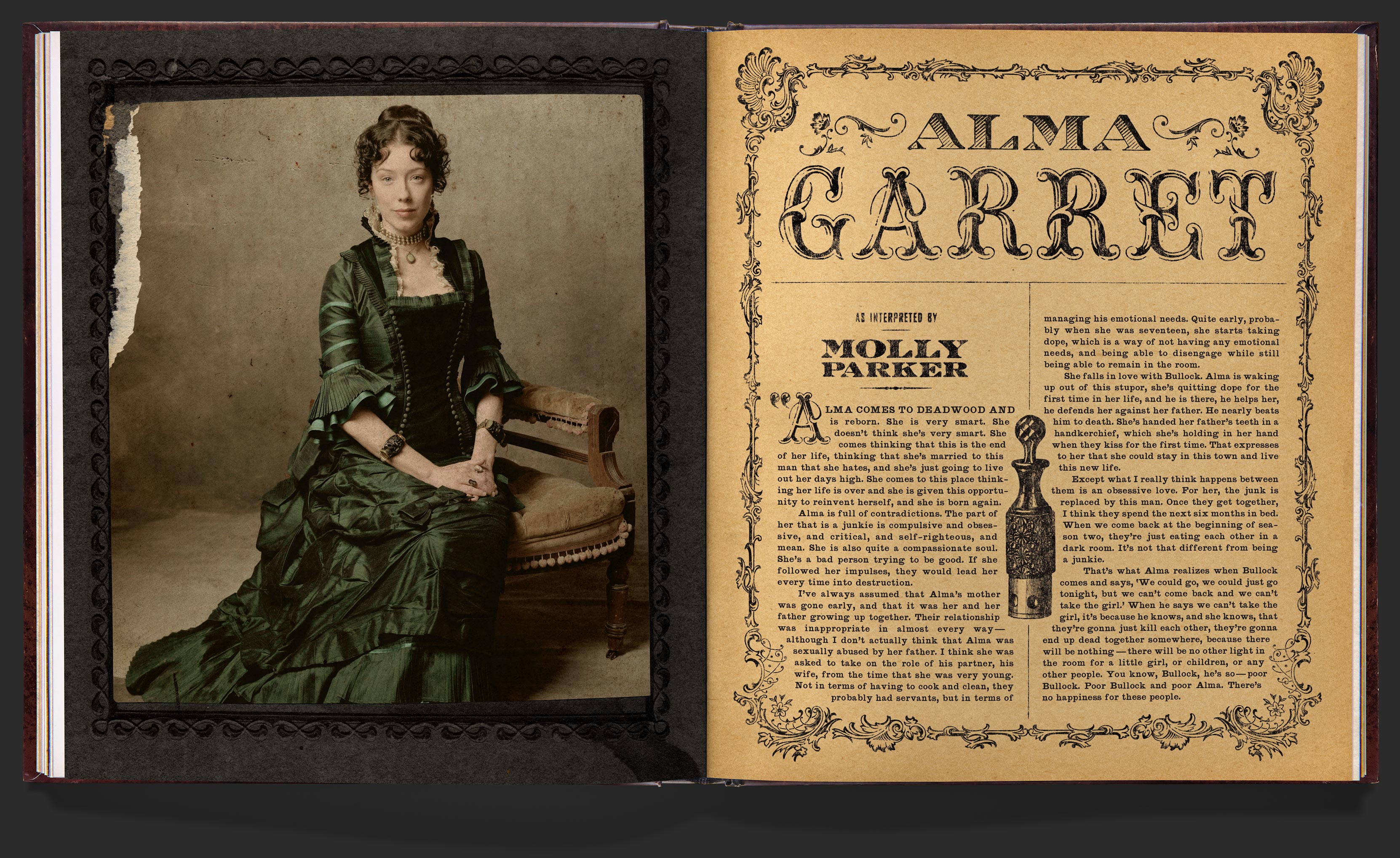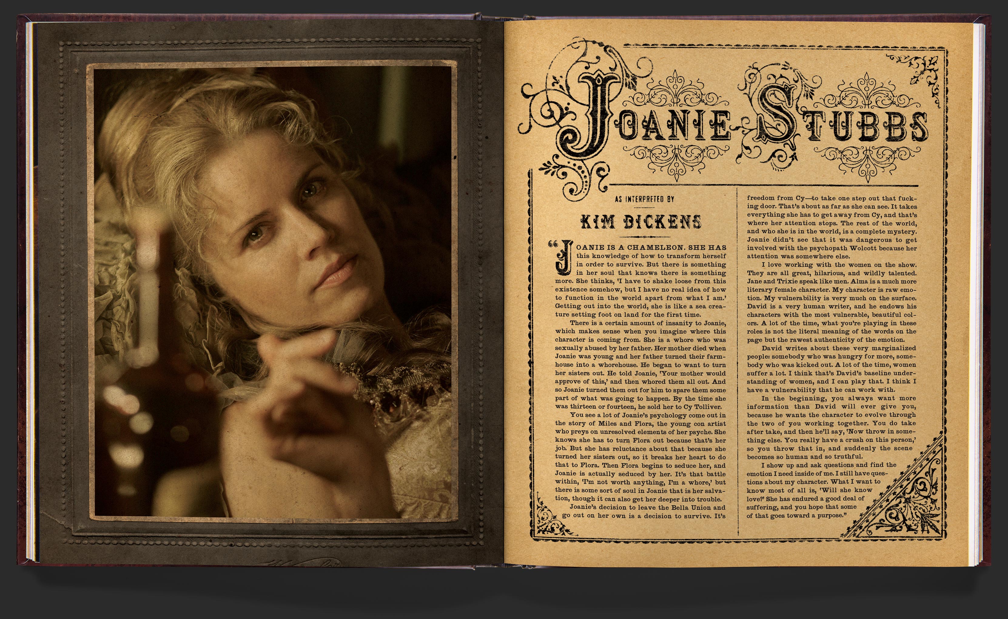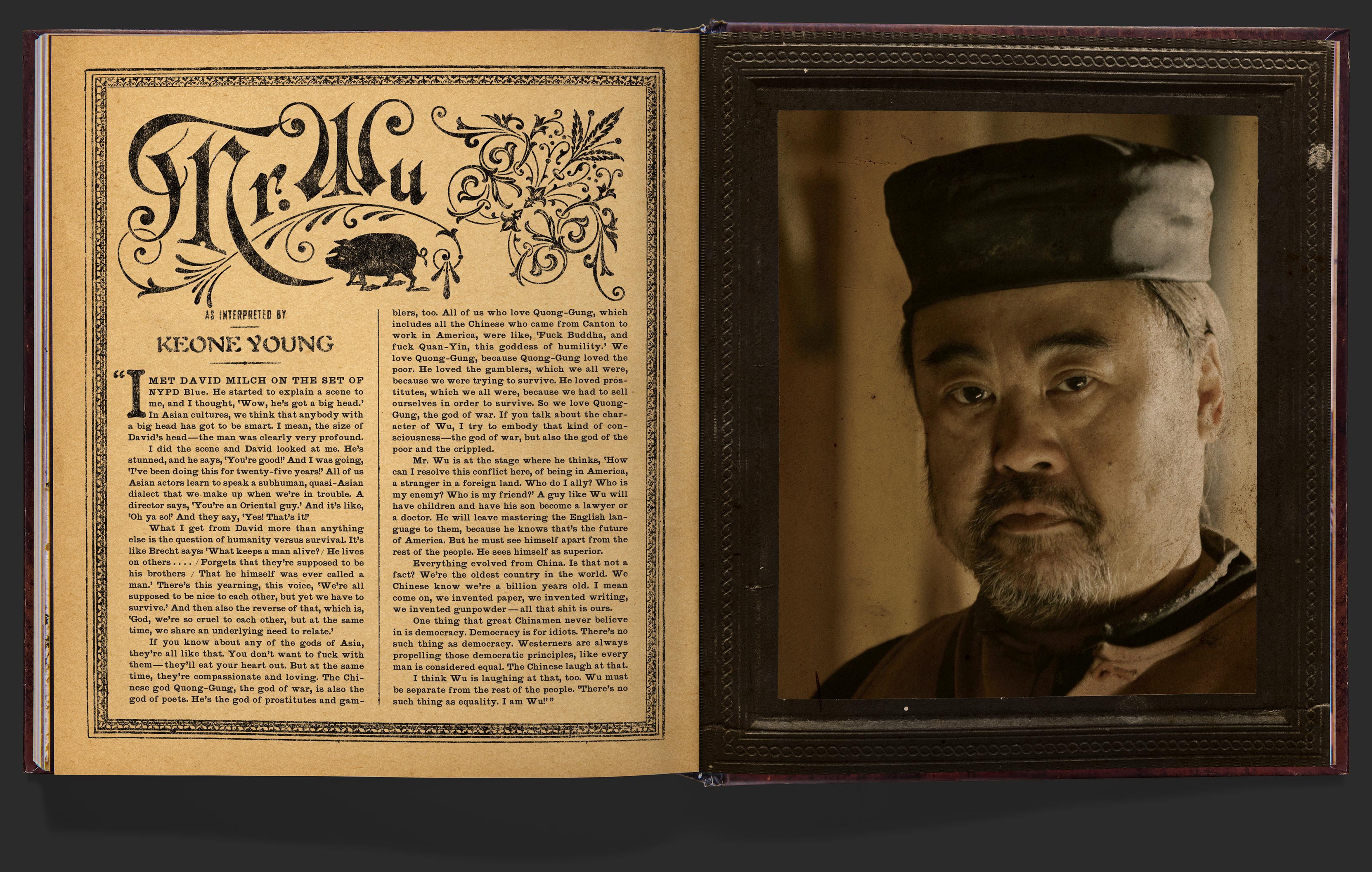 The customized typography for the character profiles is created from historically accurate letterforms scanned from old ephemera, incorporating numerous type styles that have never been converted to fonts.