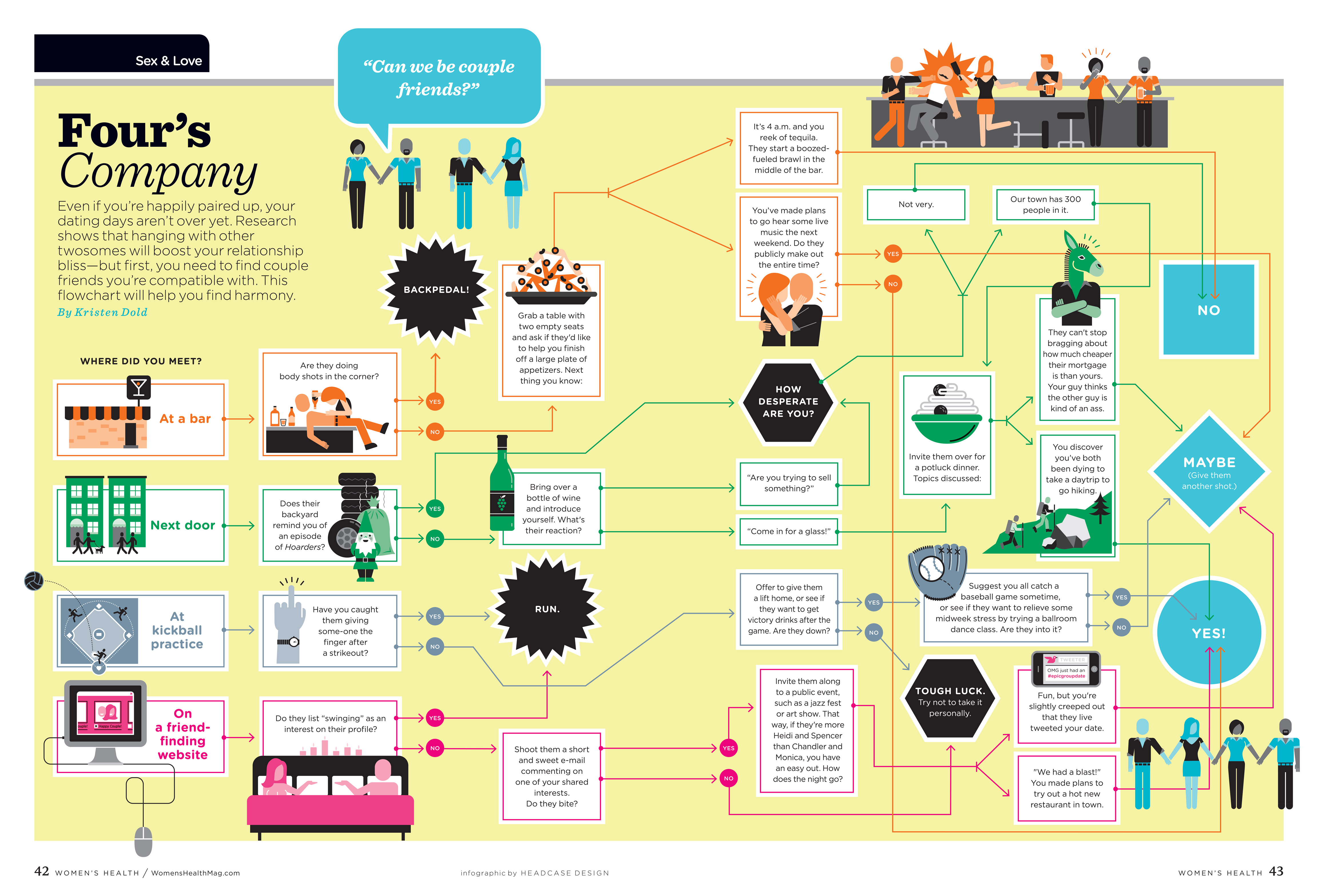 Finding the perfect “couple friends” can be quite the adventure, but it can certainly enhance your social life! This handy flowchart can help you find another couple that’s harmonious and compatible. A word of advice; if you first meet them doing body shots in the corner of a seedy bar—run!