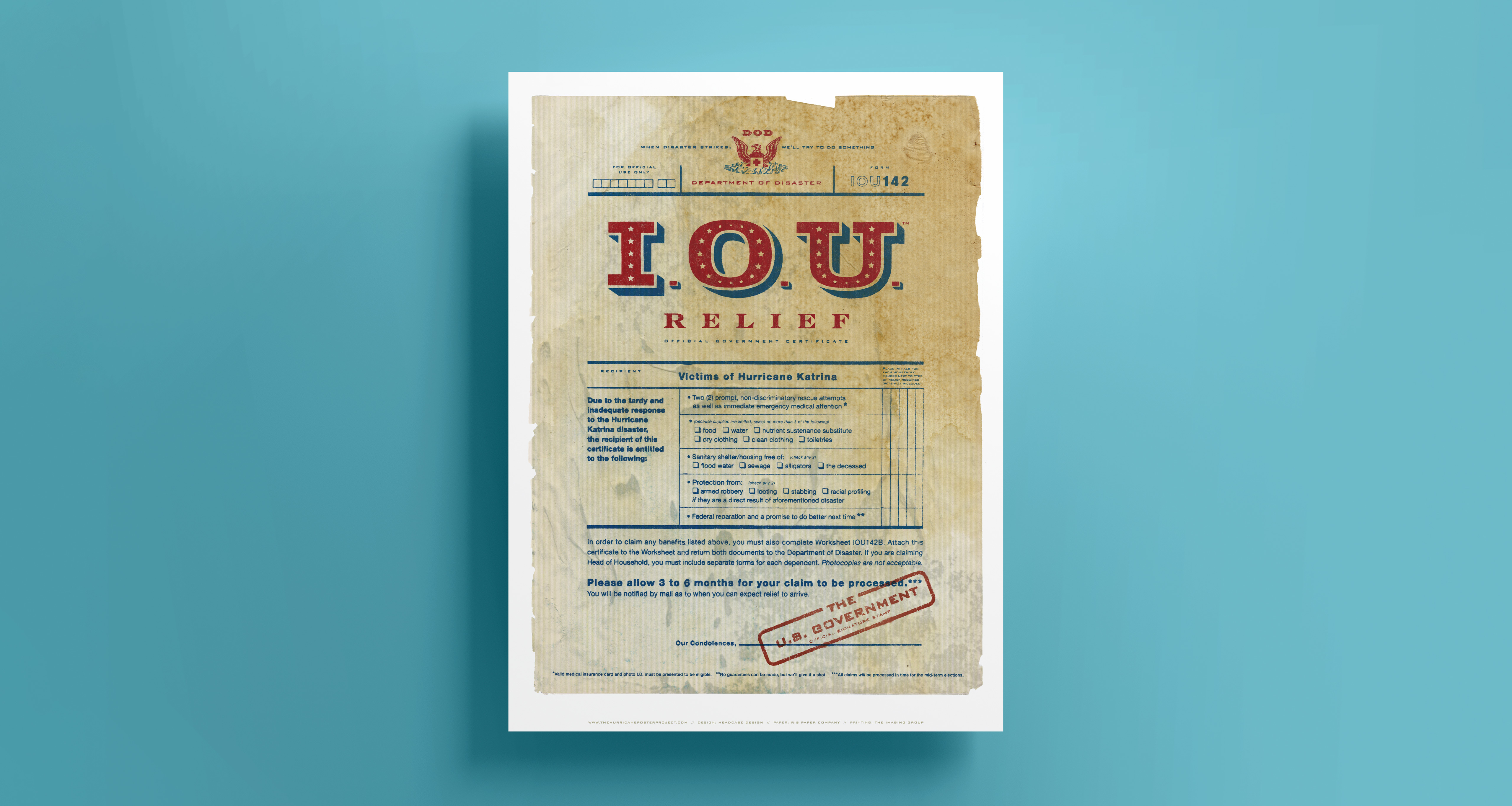 The Hurricane Poster Project was an international collaborative effort of the design community to raise funds for the victims of Hurricane Katrina. Participants created posters that were sold online, with all proceeds donated to The American Red Cross. Our poster depicts an I.O.U. certificate from the U.S. Government to the people affected by the devastating hurricane.
