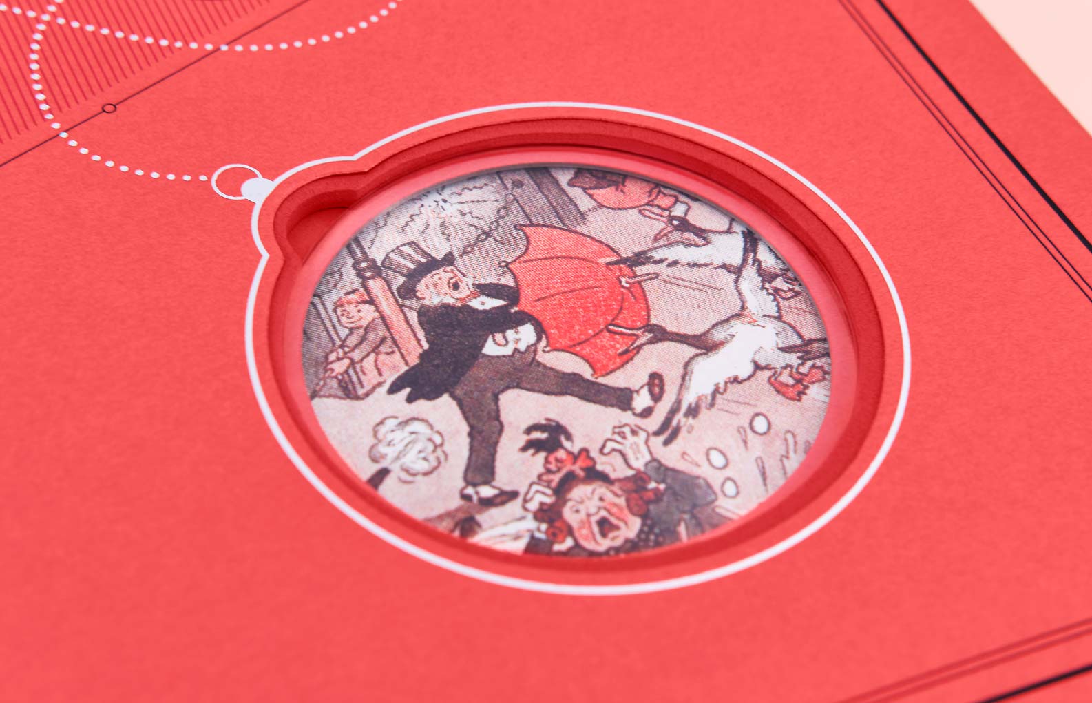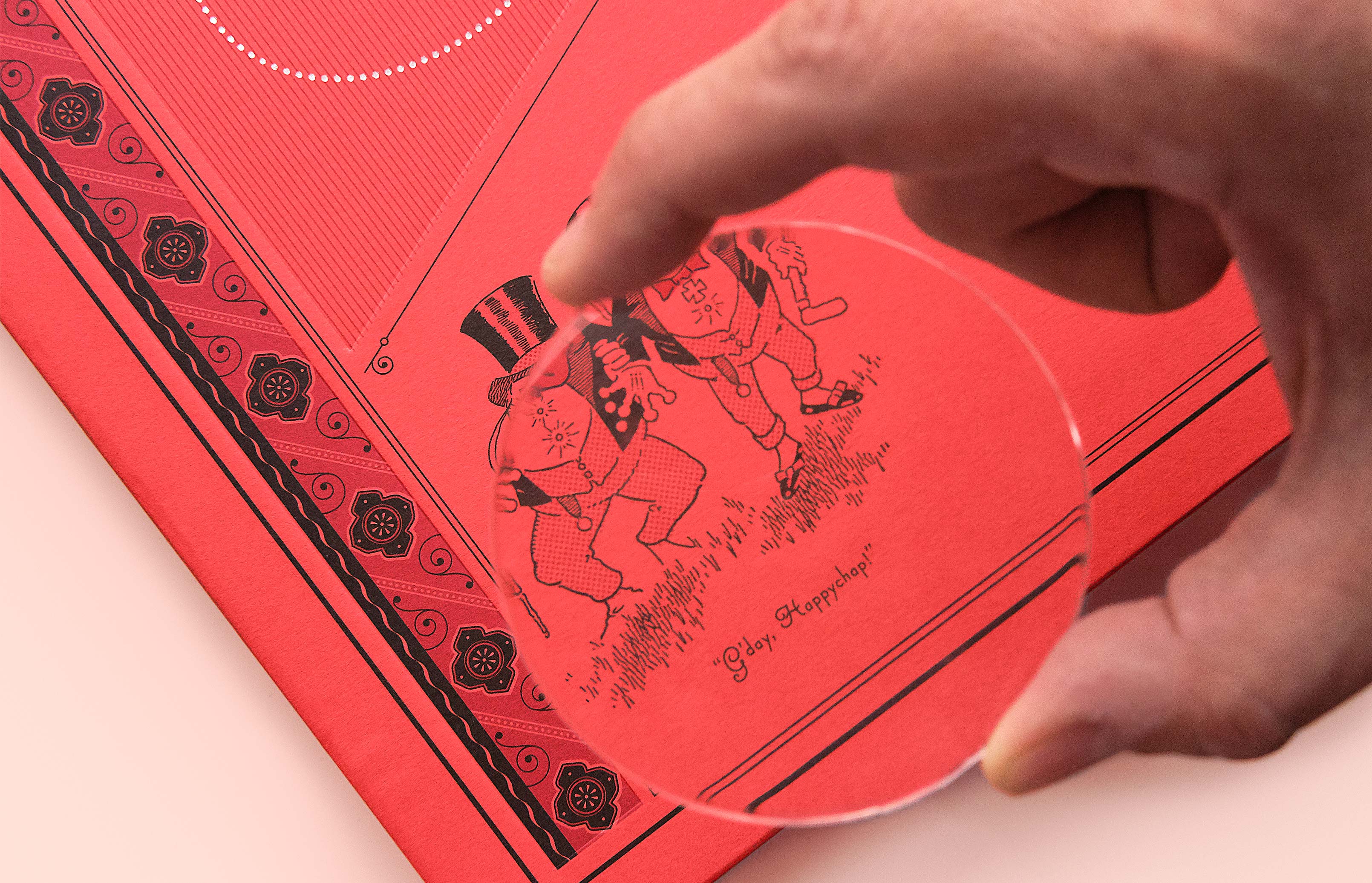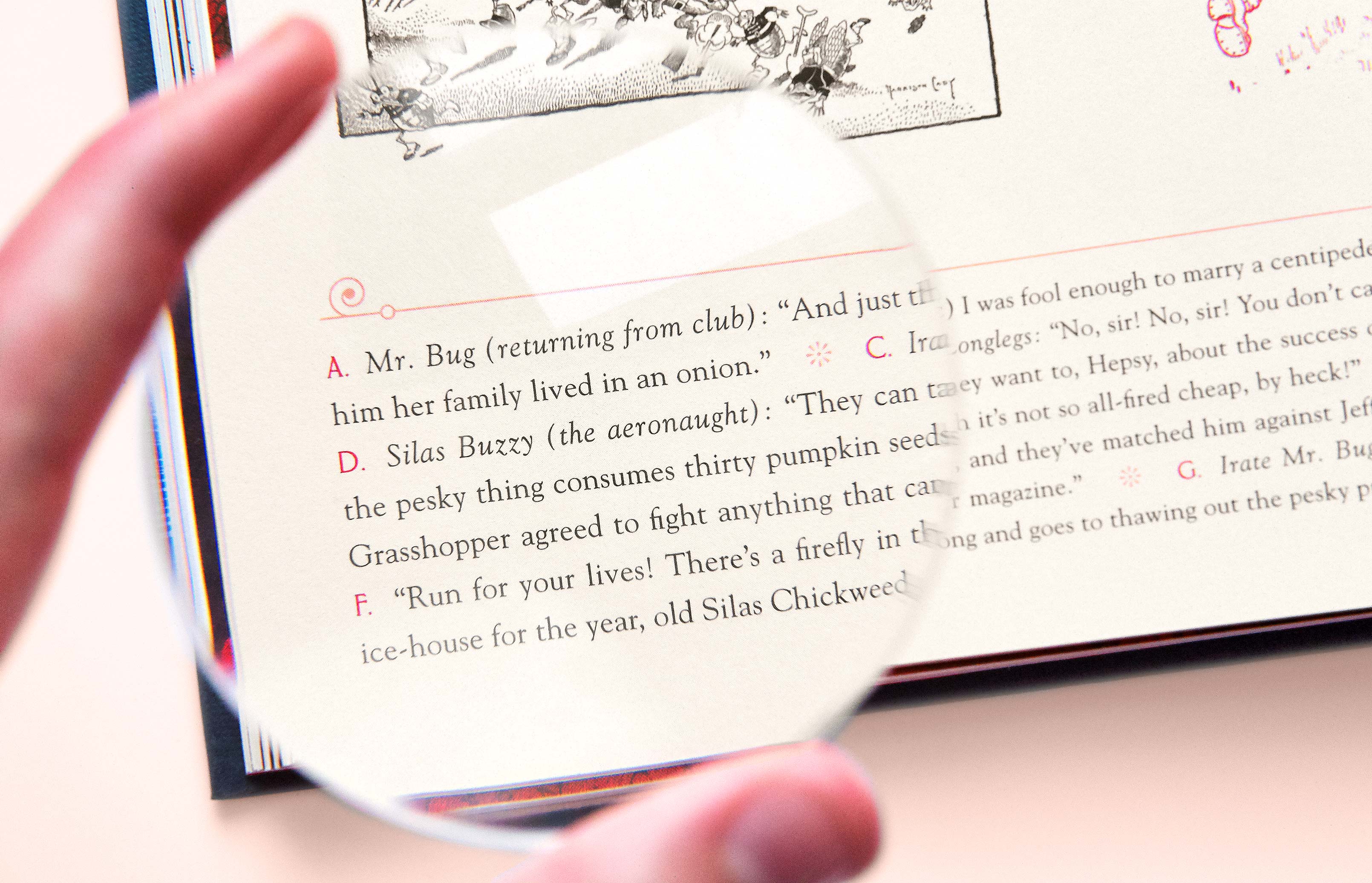 A removable magnifier is embedded in the die-cut window on the slipcase, and a whimsical illustration is revealed in the window when you remove the book from the slip.