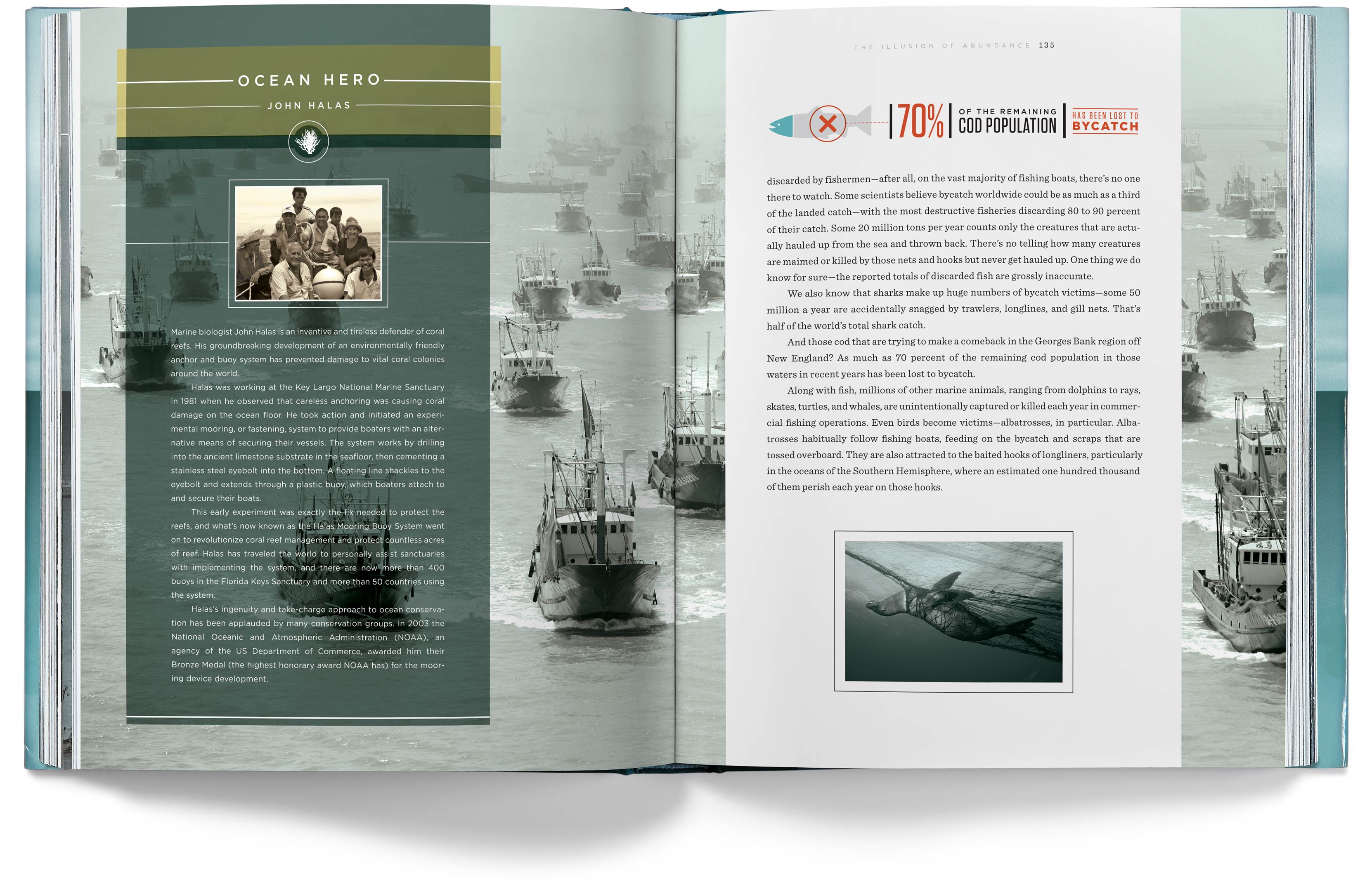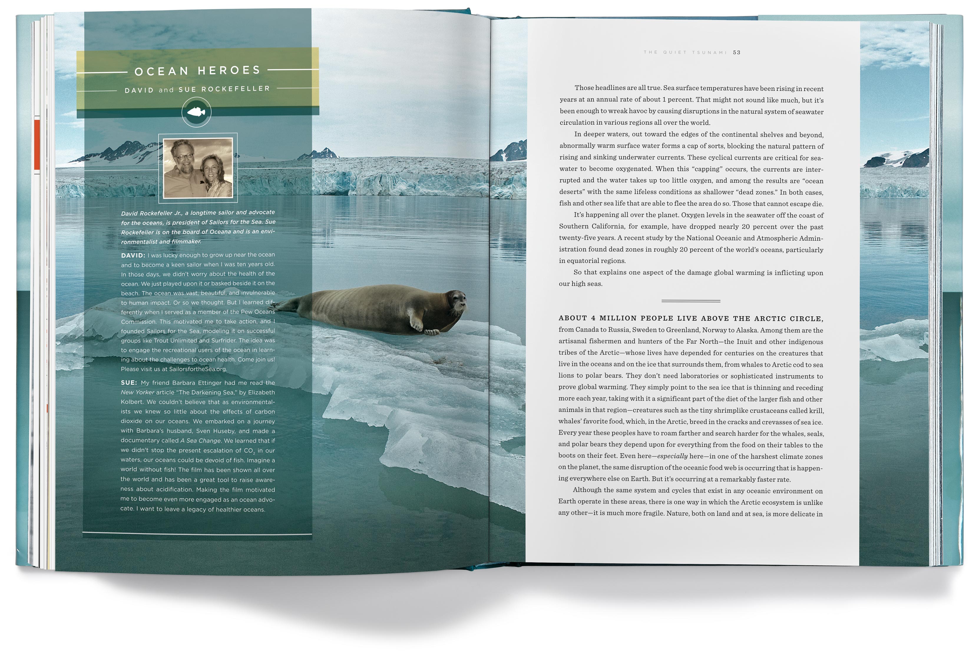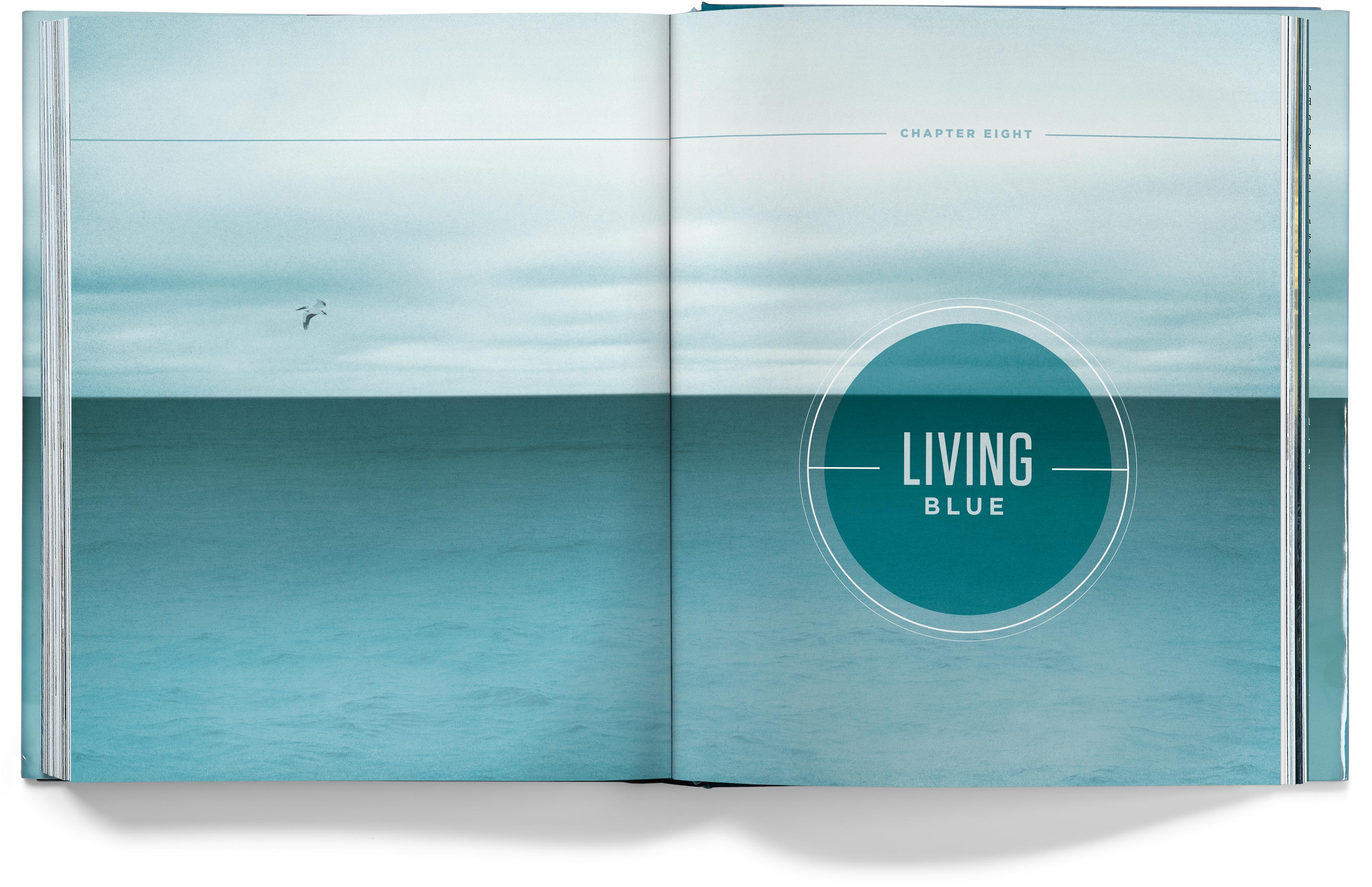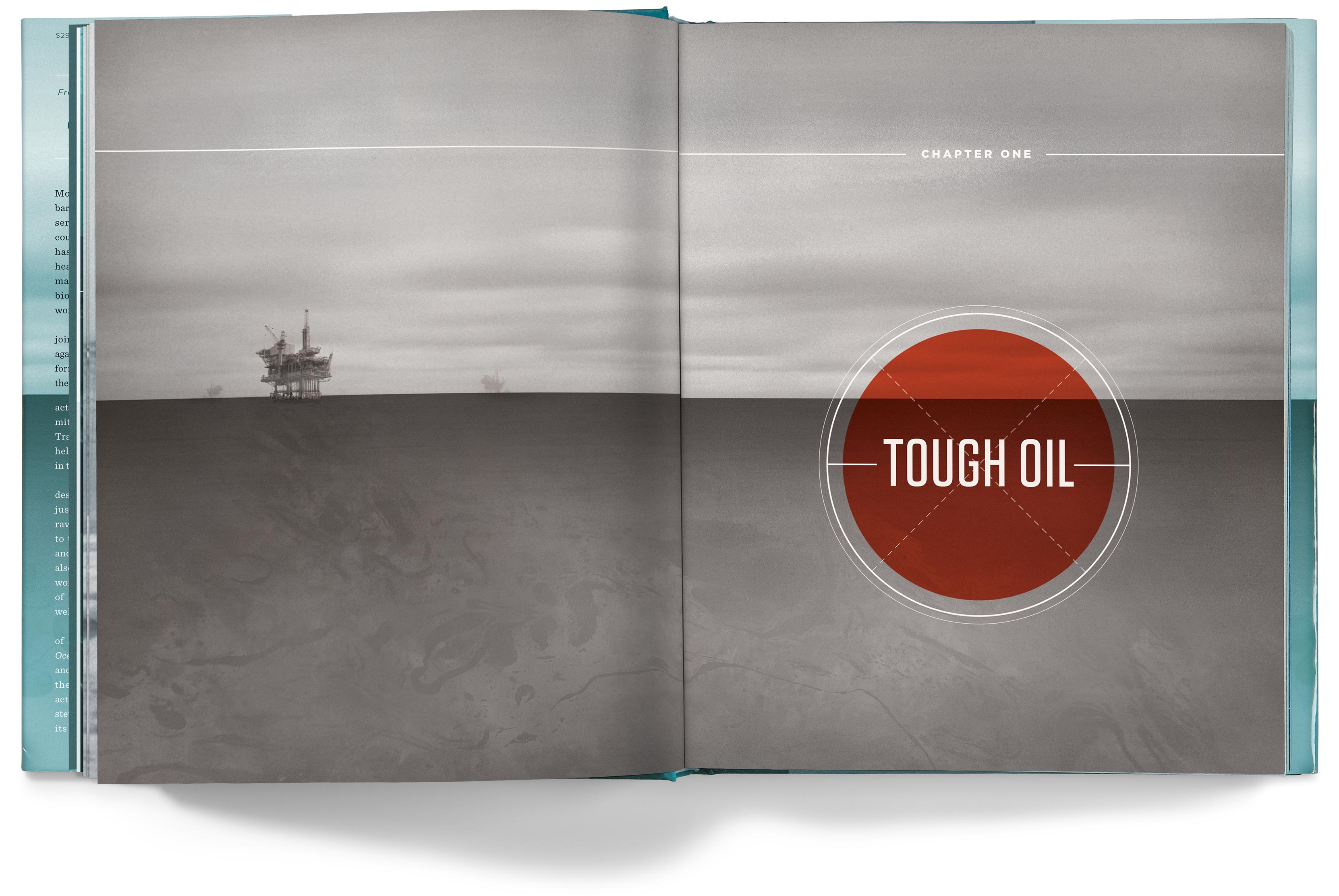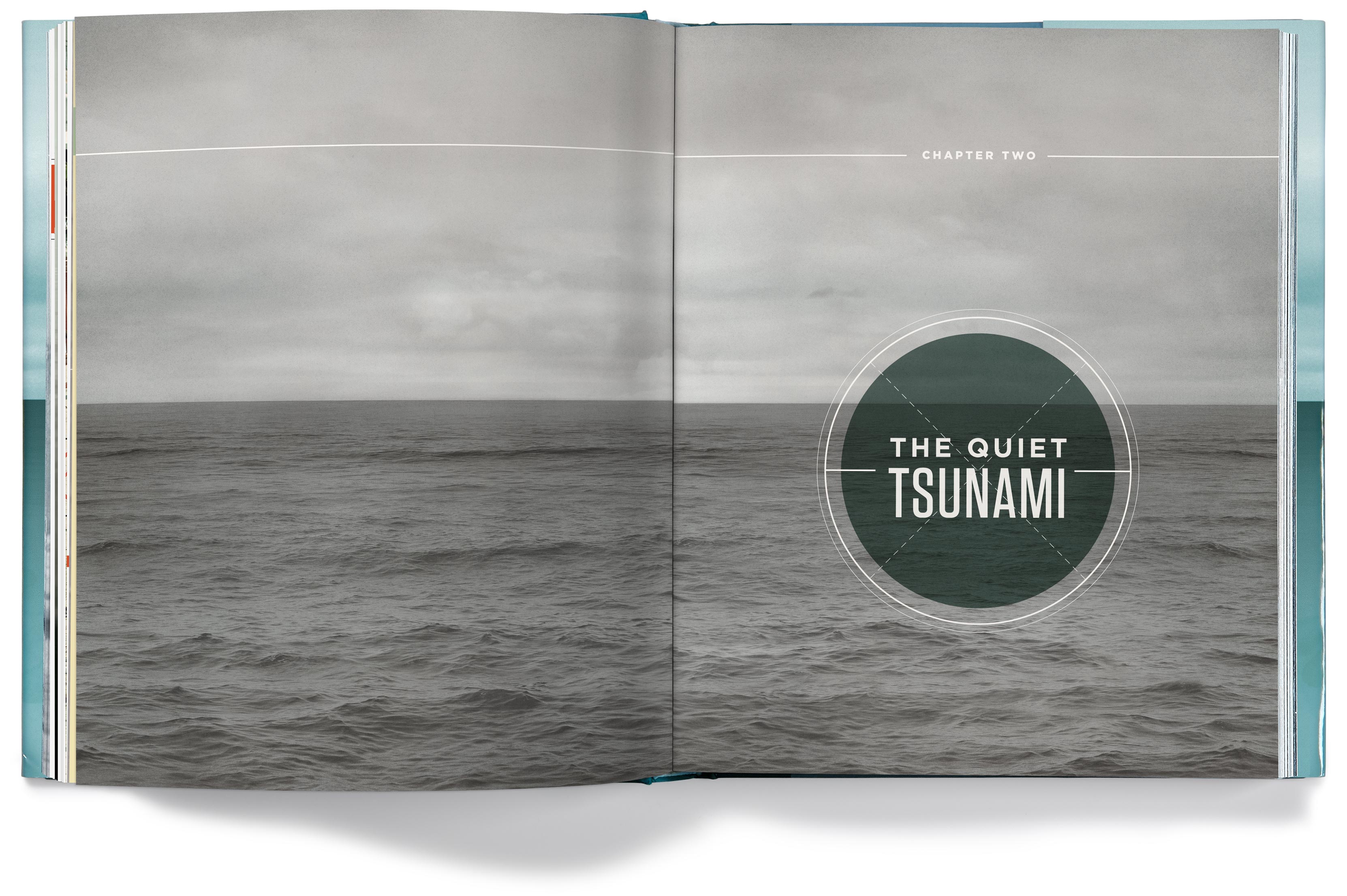 The chapter openers depict the various problems our oceans face, but they imply hope for the future by having the color tones of the photos transition from a grim gray in the early chapters to an optimistic blue by the last chapter.