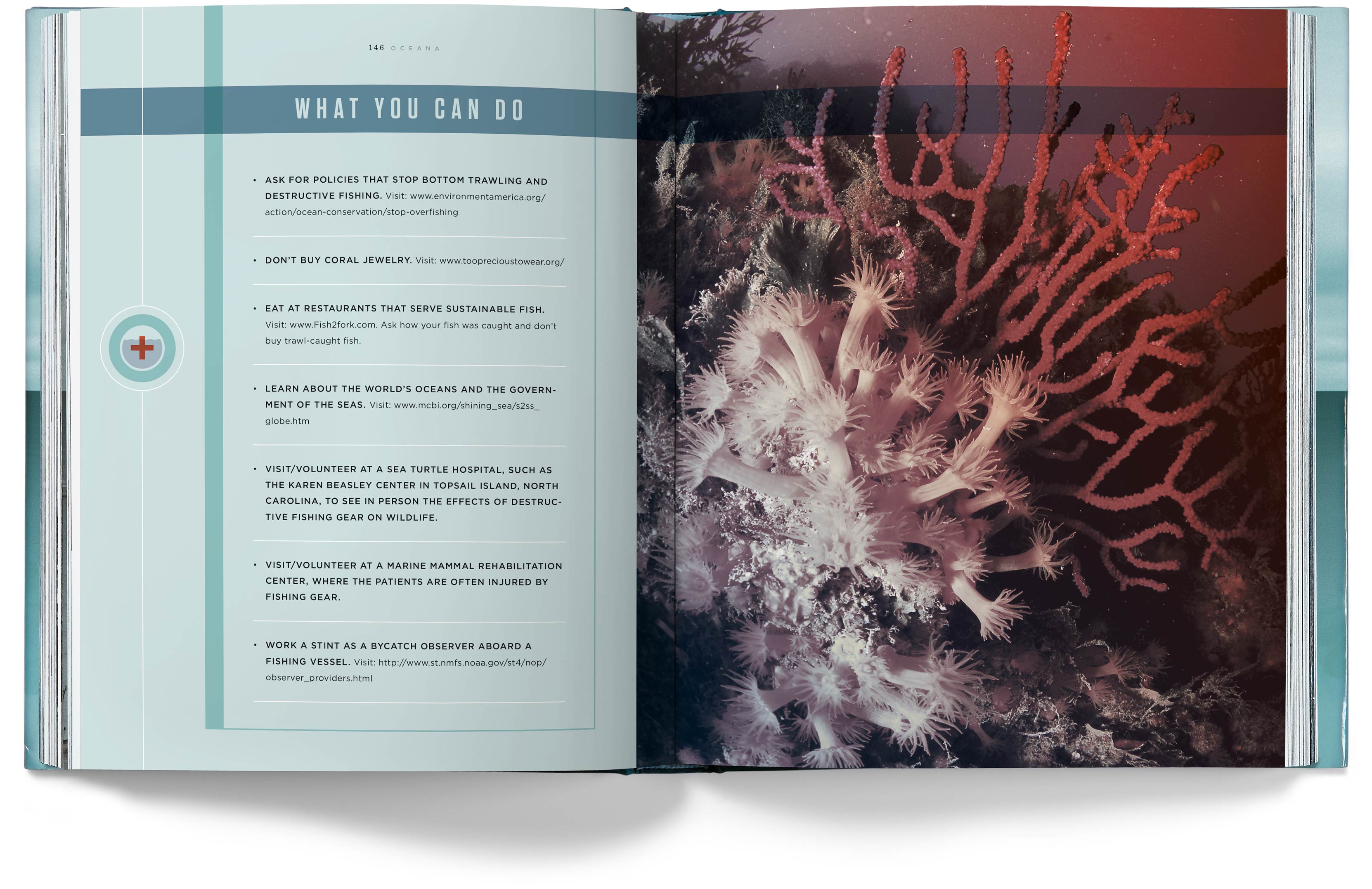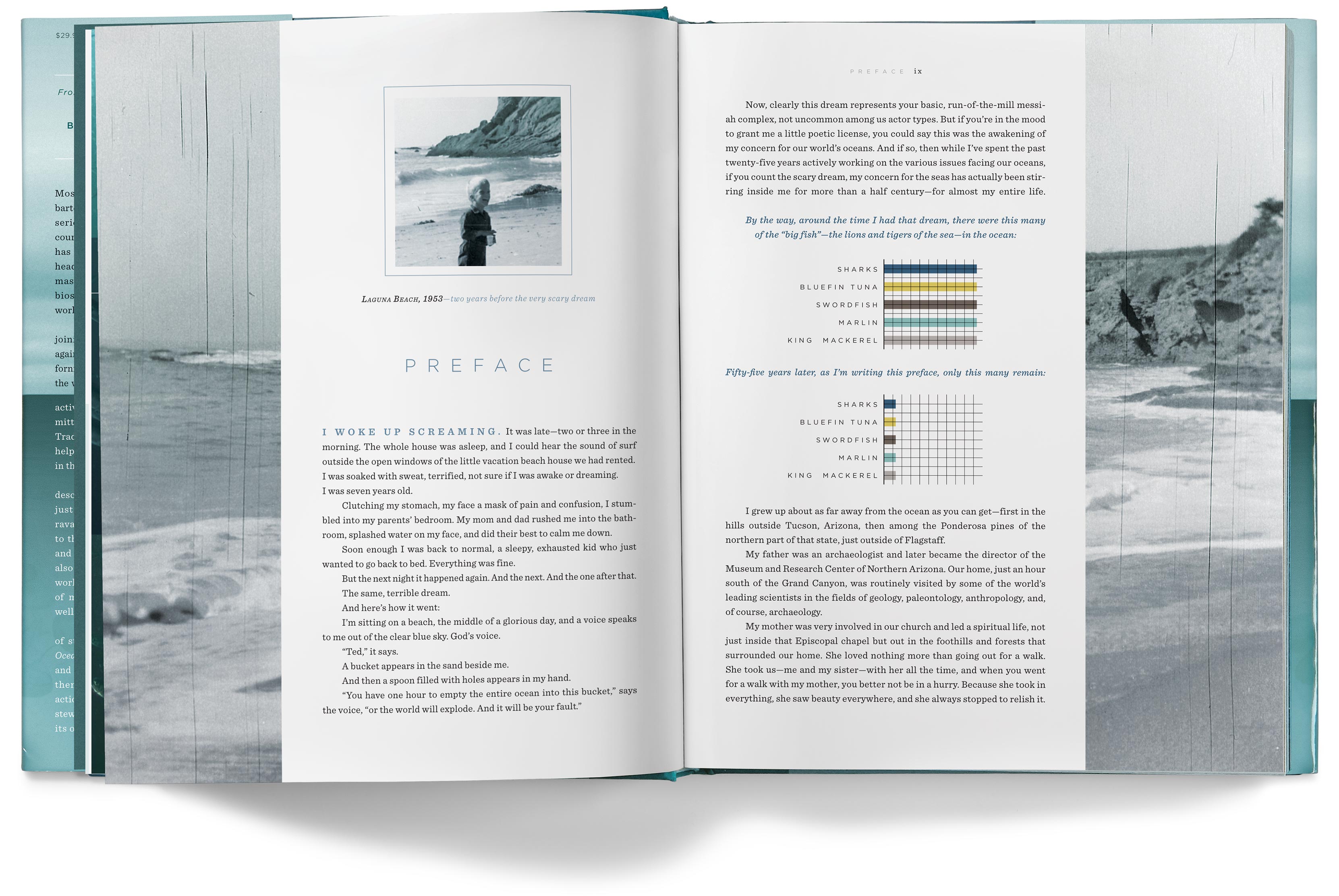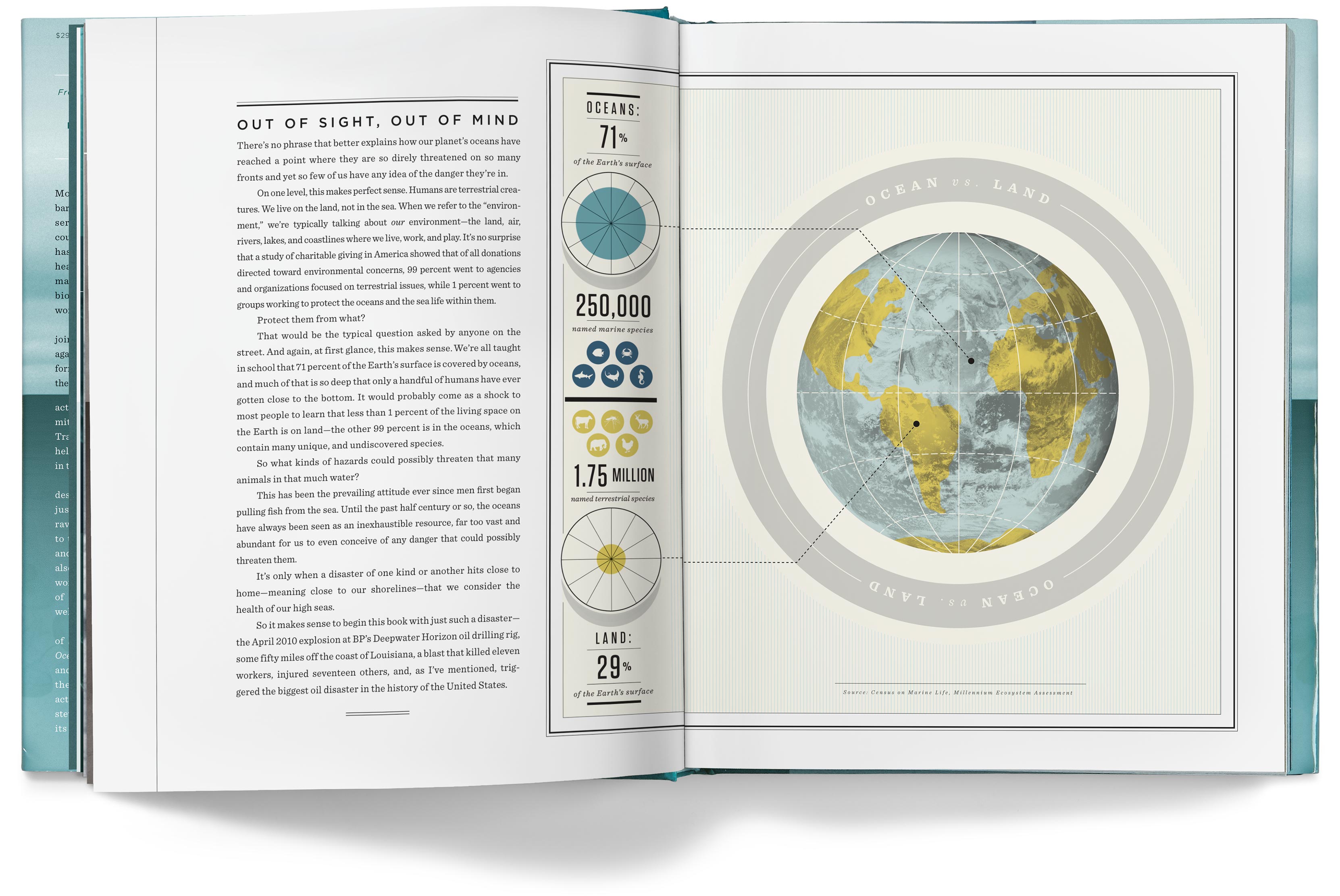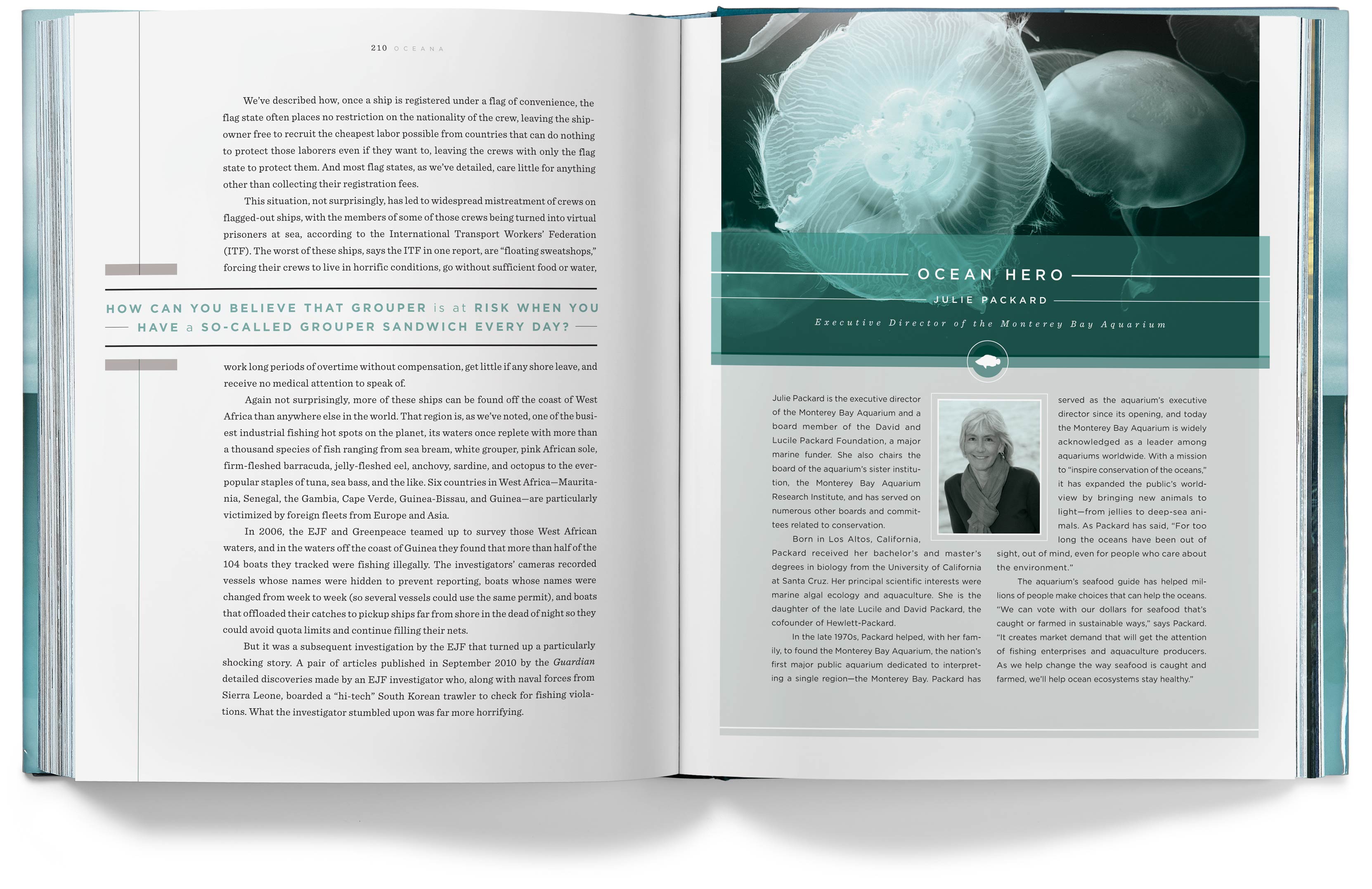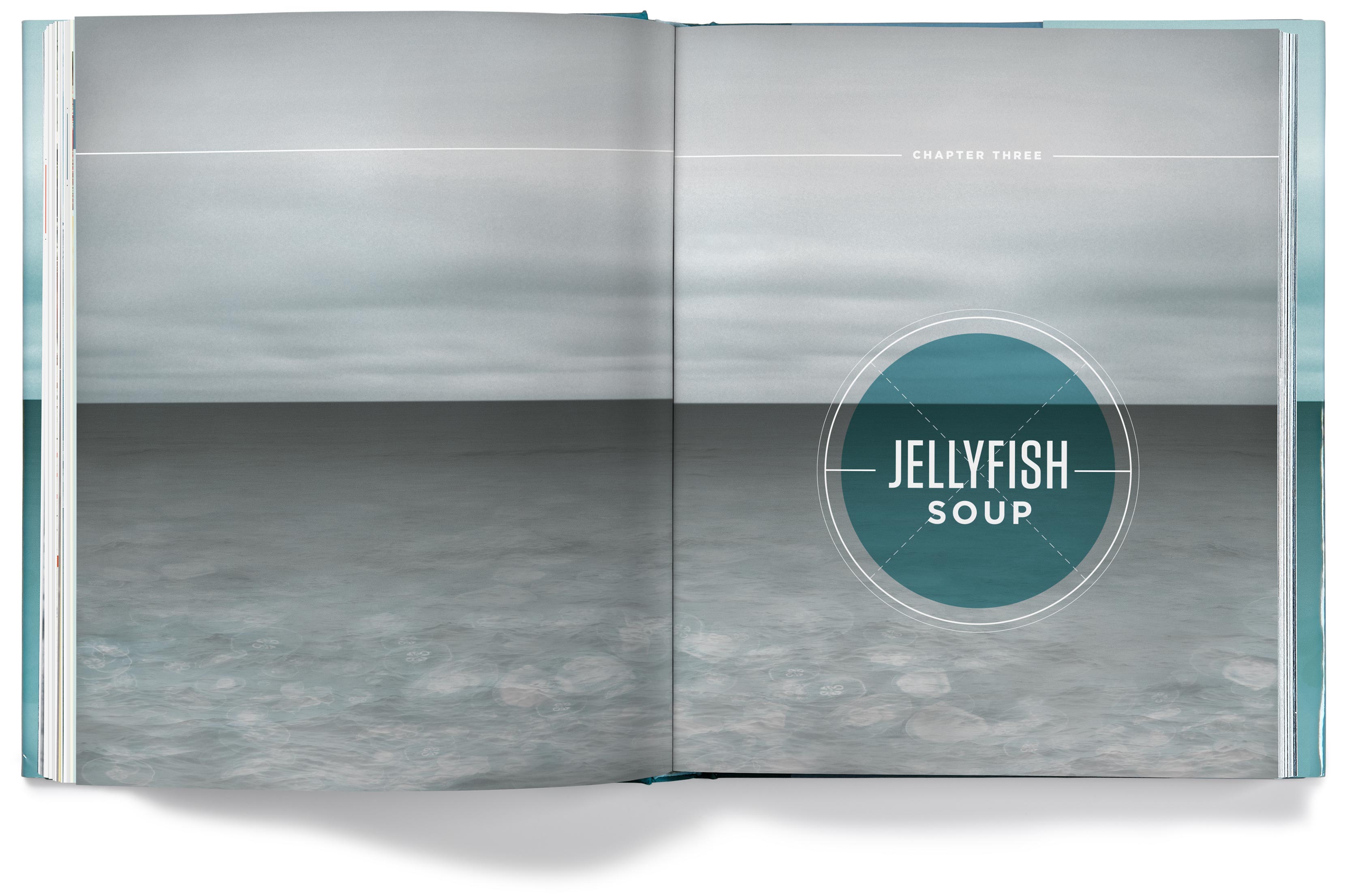The chapter openers depict the various problems our oceans face, but they imply hope for the future by having the color tones of the photos transition from a grim gray in the early chapters to an optimistic blue by the last chapter.