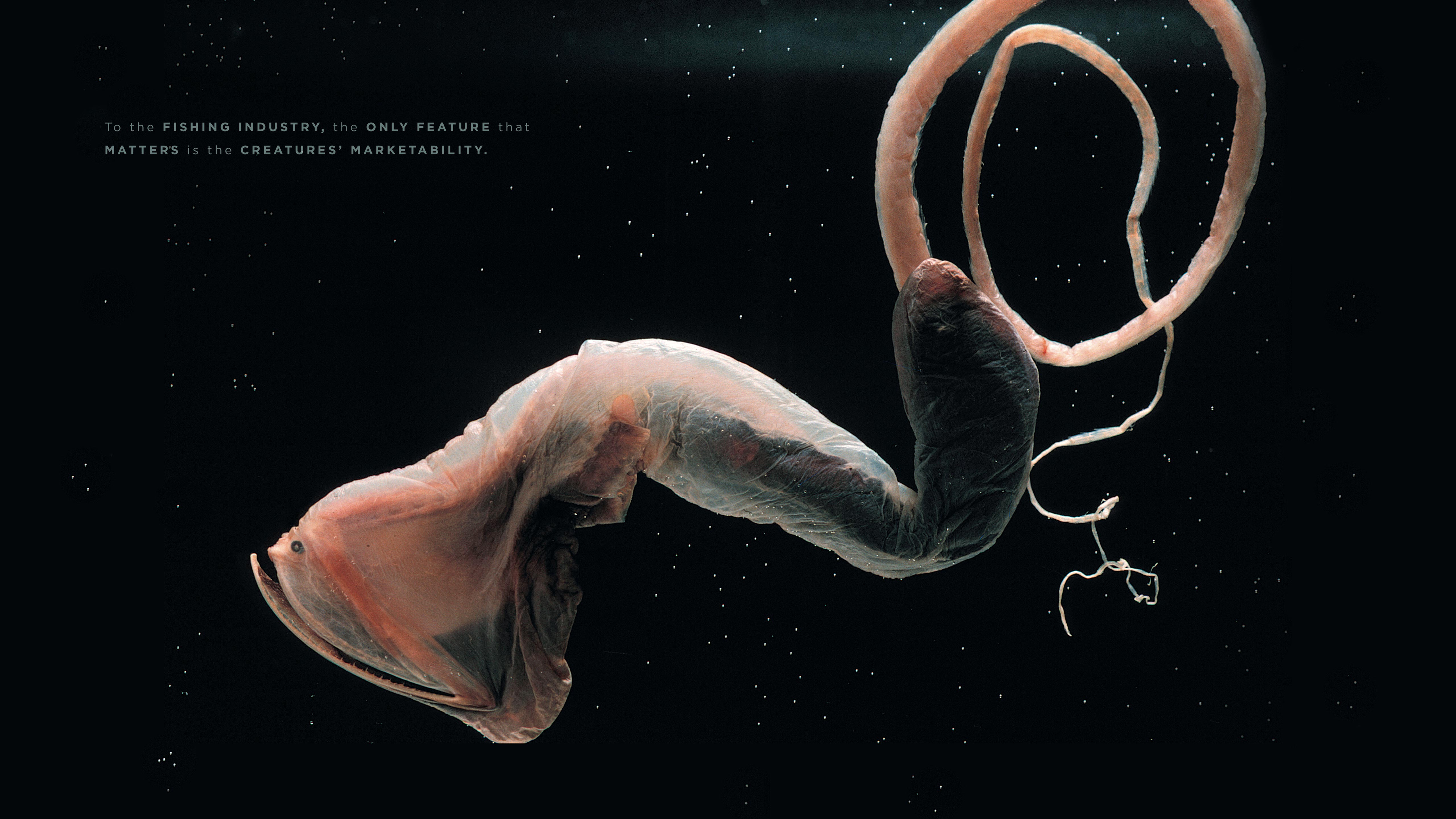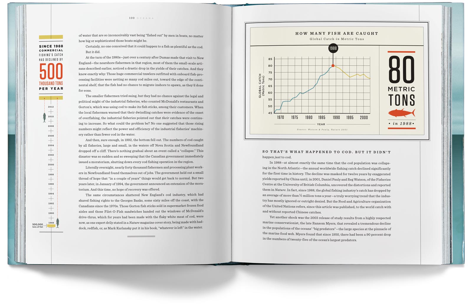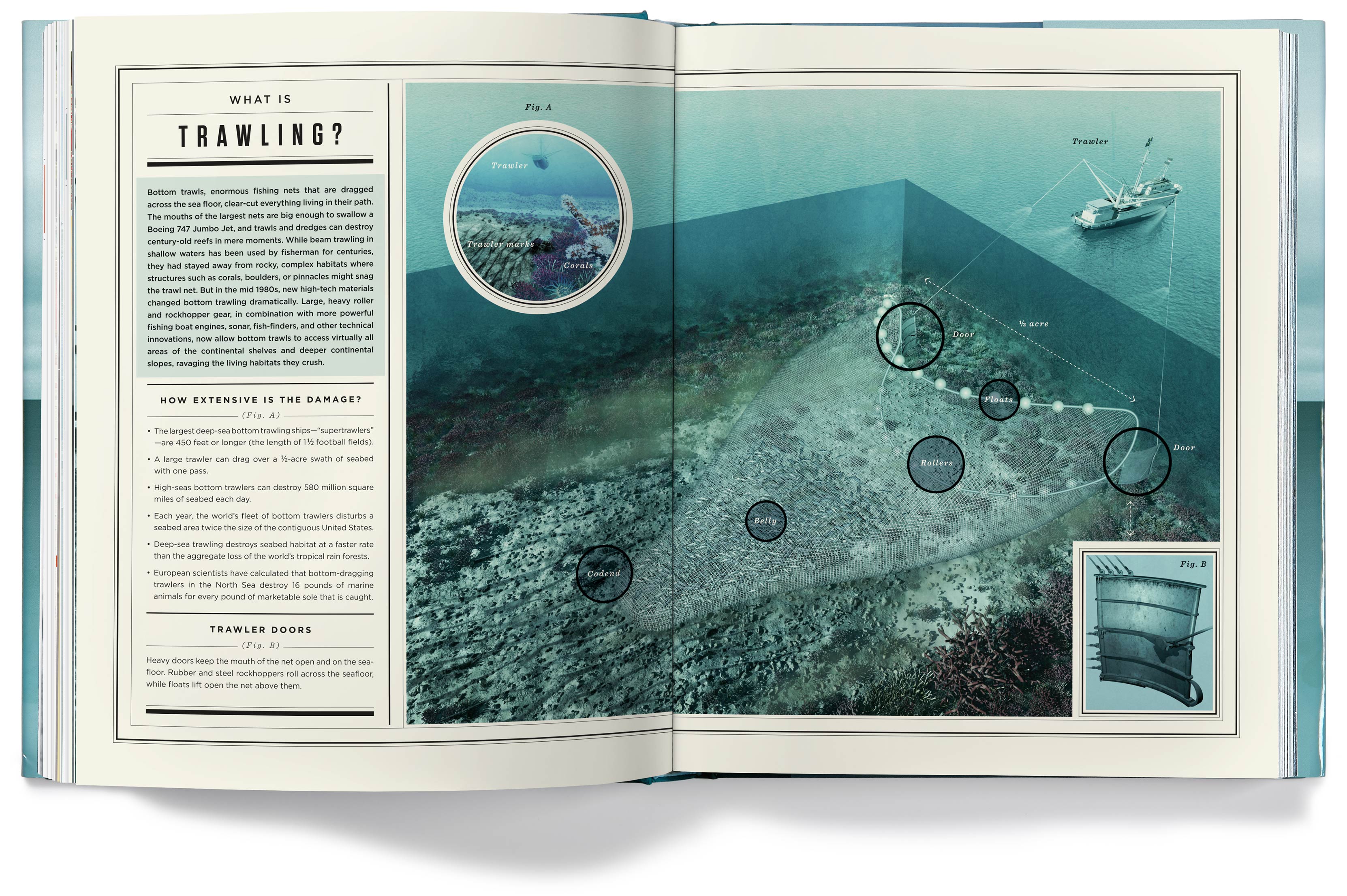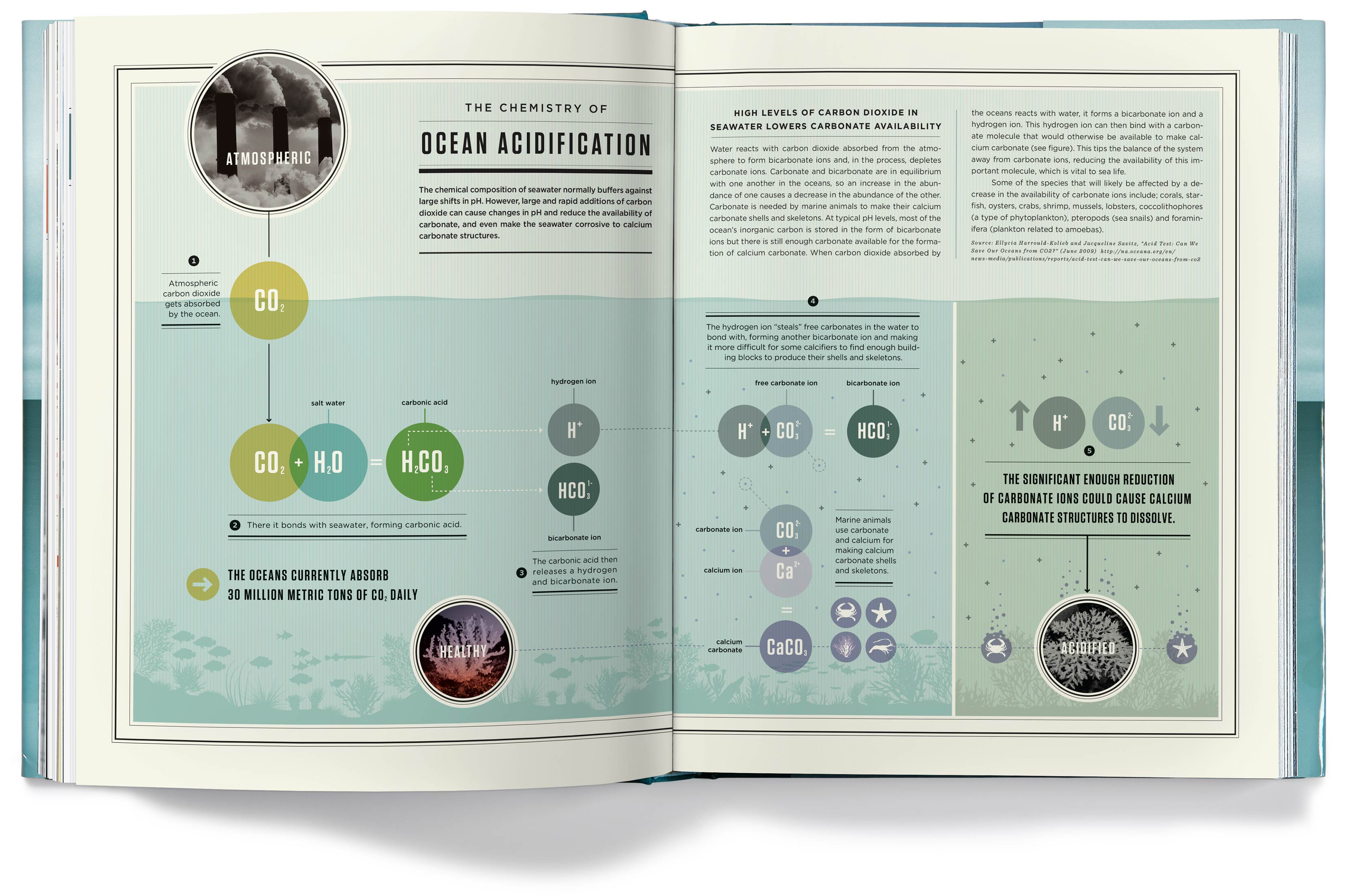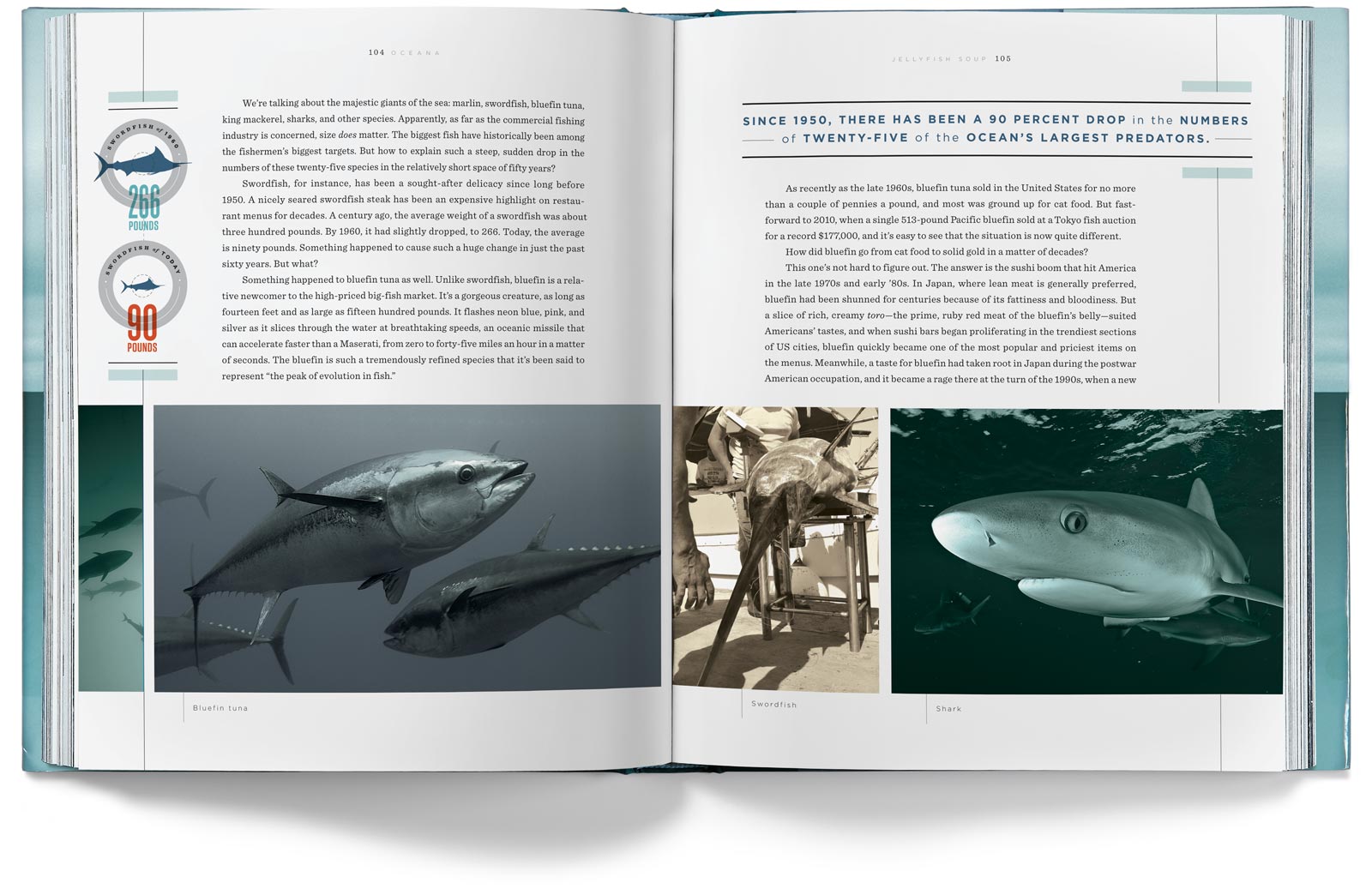 The chapter openers depict the various problems our oceans face, but they imply hope for the future by having the color tones of the photos transition from a grim gray in the early chapters to an optimistic blue by the last chapter.