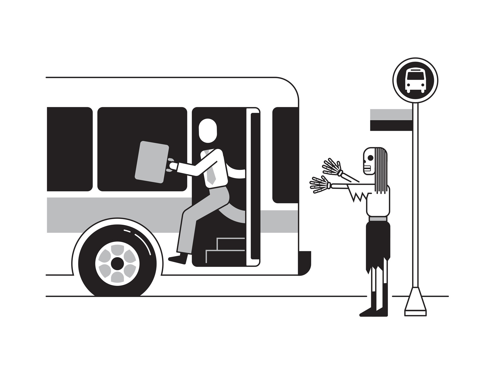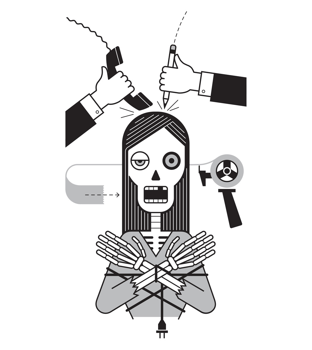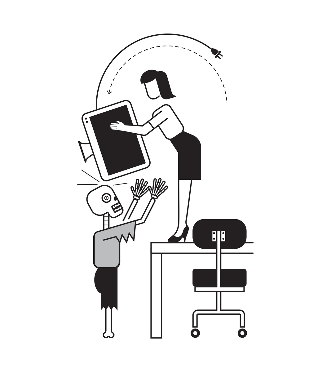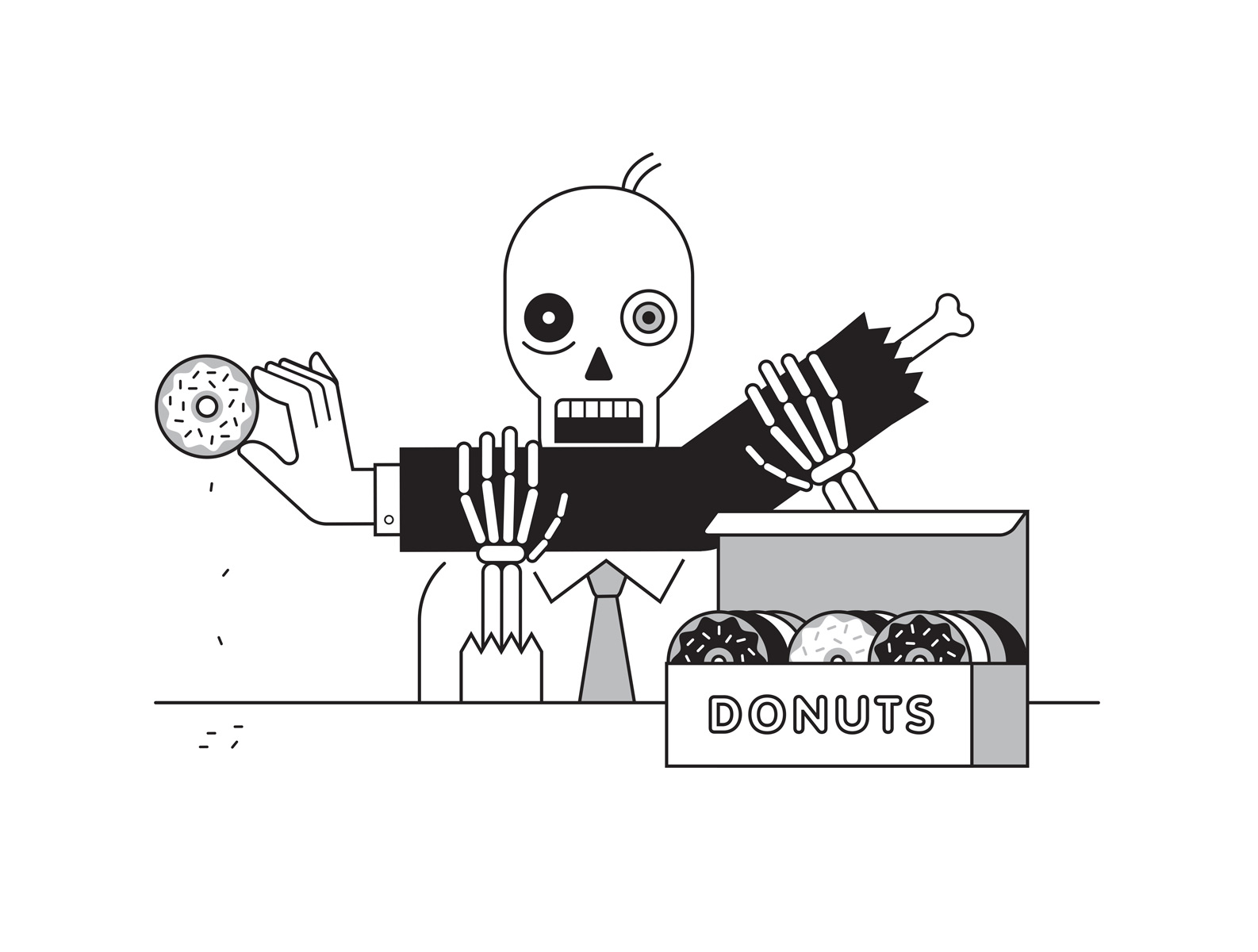 The New Yorker contacted us to create tiny spot illustrations — about two inches each — to be scattered around the magazine. The theme: “Exit strategy from the Times Square office during a Zombie Apocalypse.” Right up our alley….