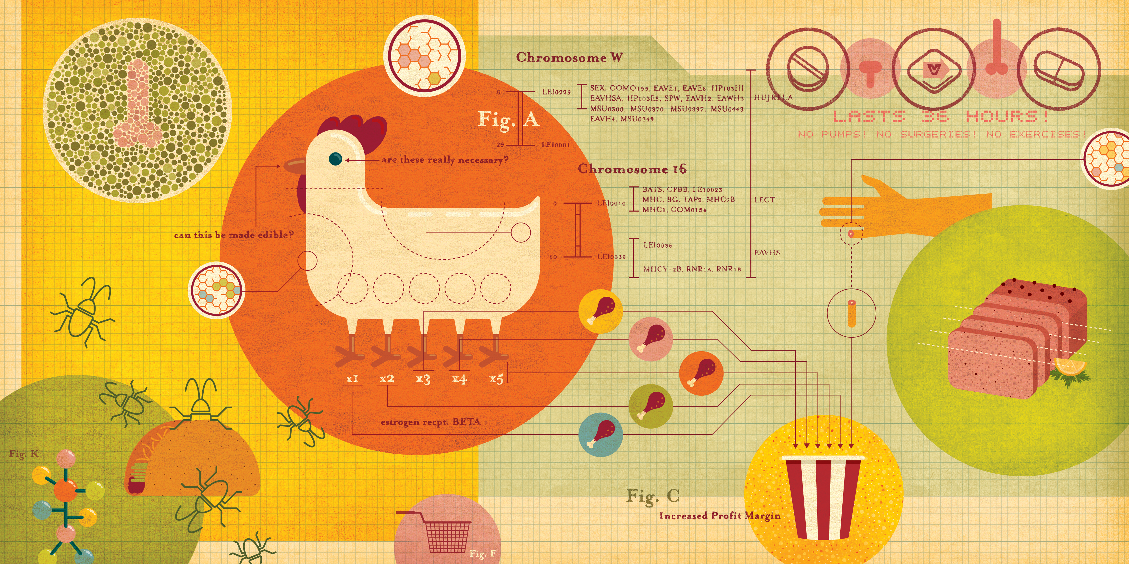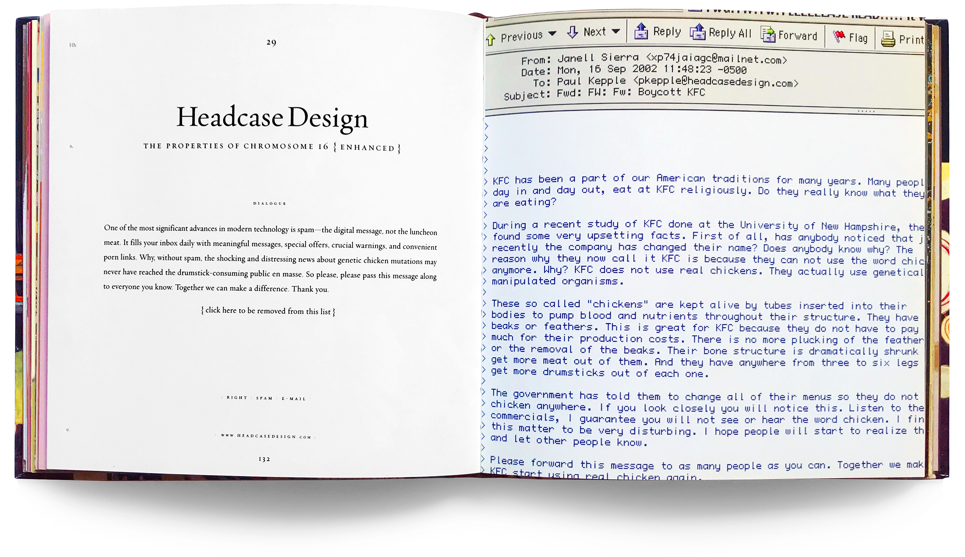Mark Murphy invited us to participate in his curated illustration resource book Dialogue: The Fine Art of Conversation. Each artist had to illustrate a found letter or piece of correspondence. “Because I am perpetually swamped in junk mail, I chose to base this piece on a spam-email rumor that Kentucky Fried Chicken had to shorten its name to KFC because they used genetically manipulated organisms instead of real chicken to up their profit margin.” — P. K.