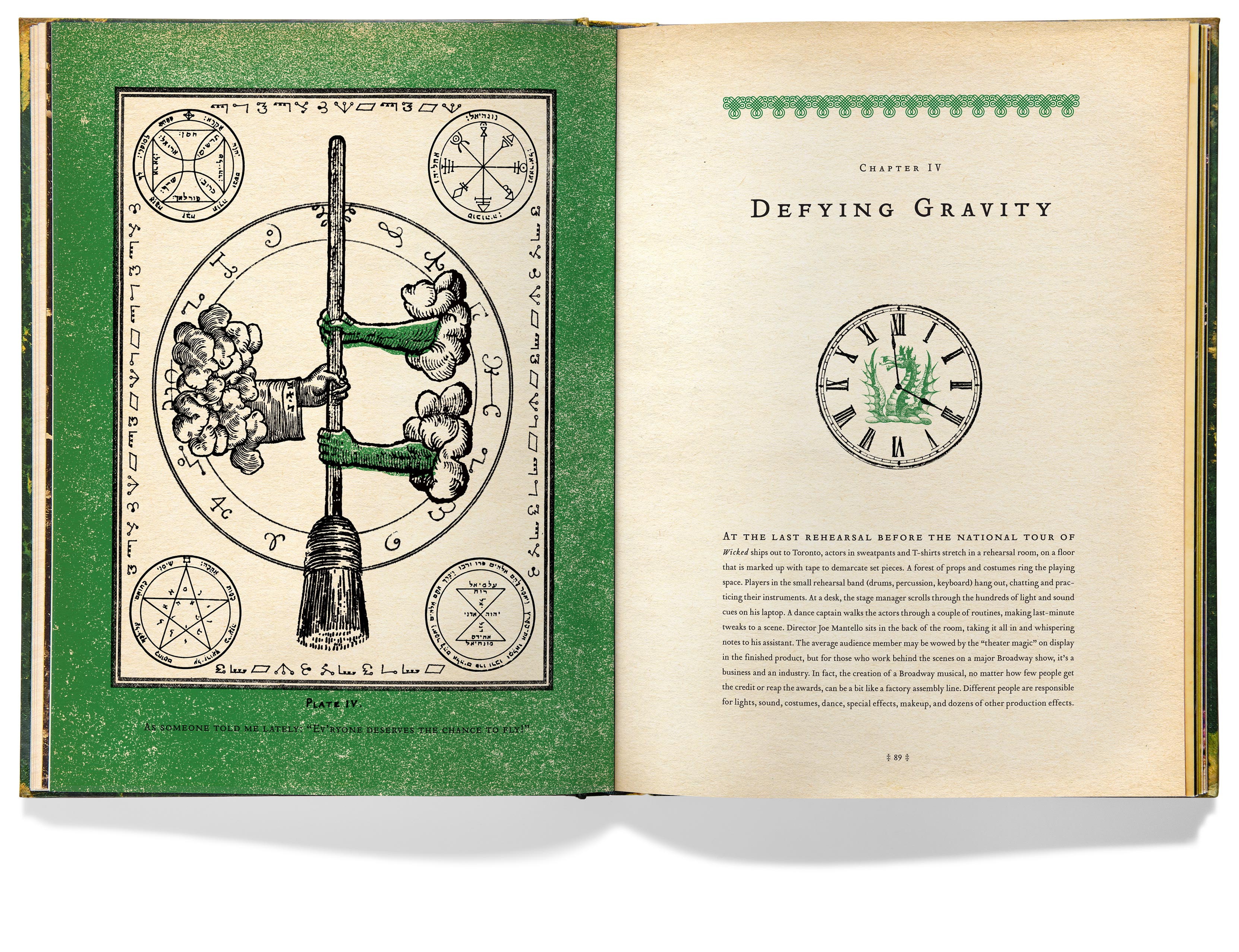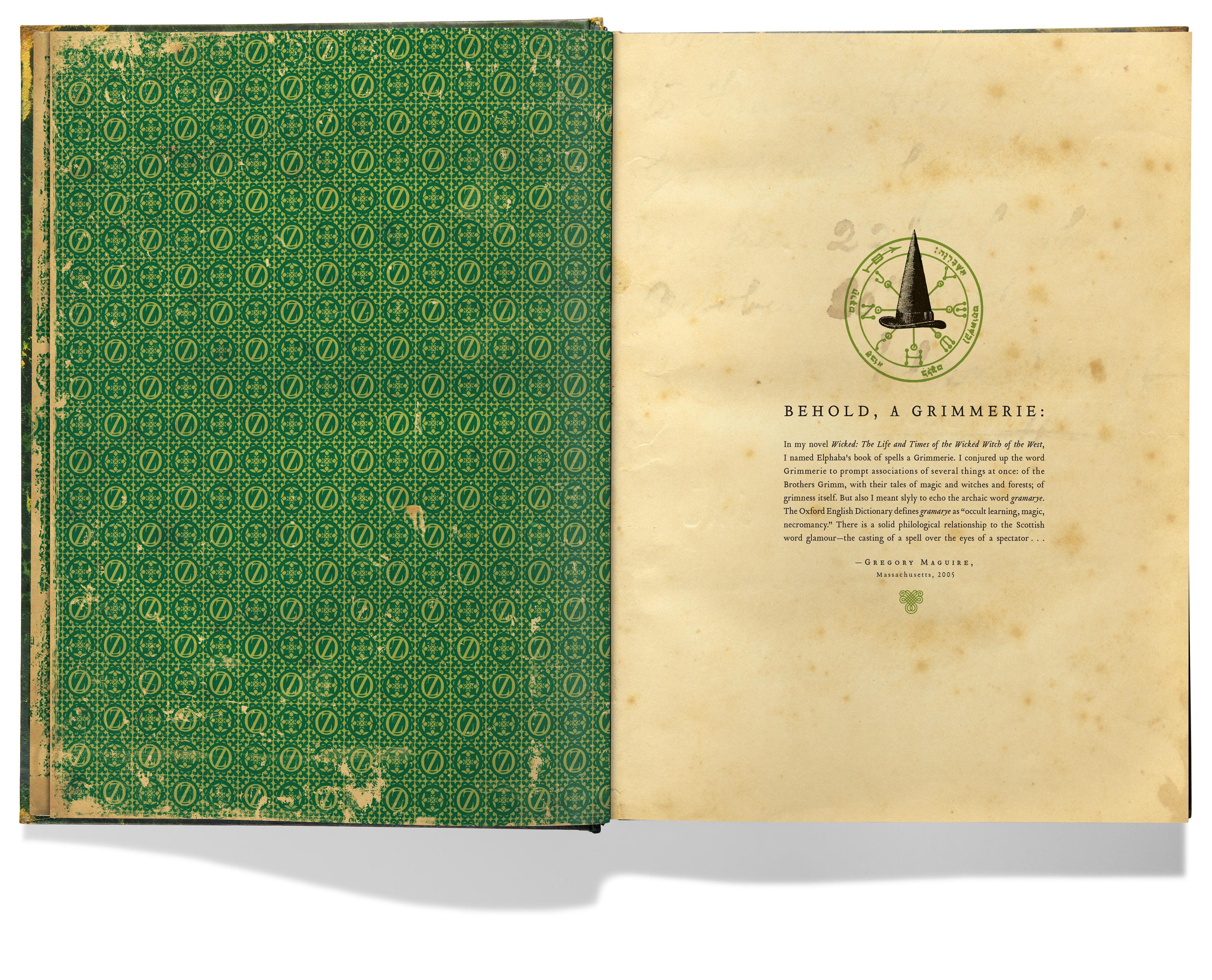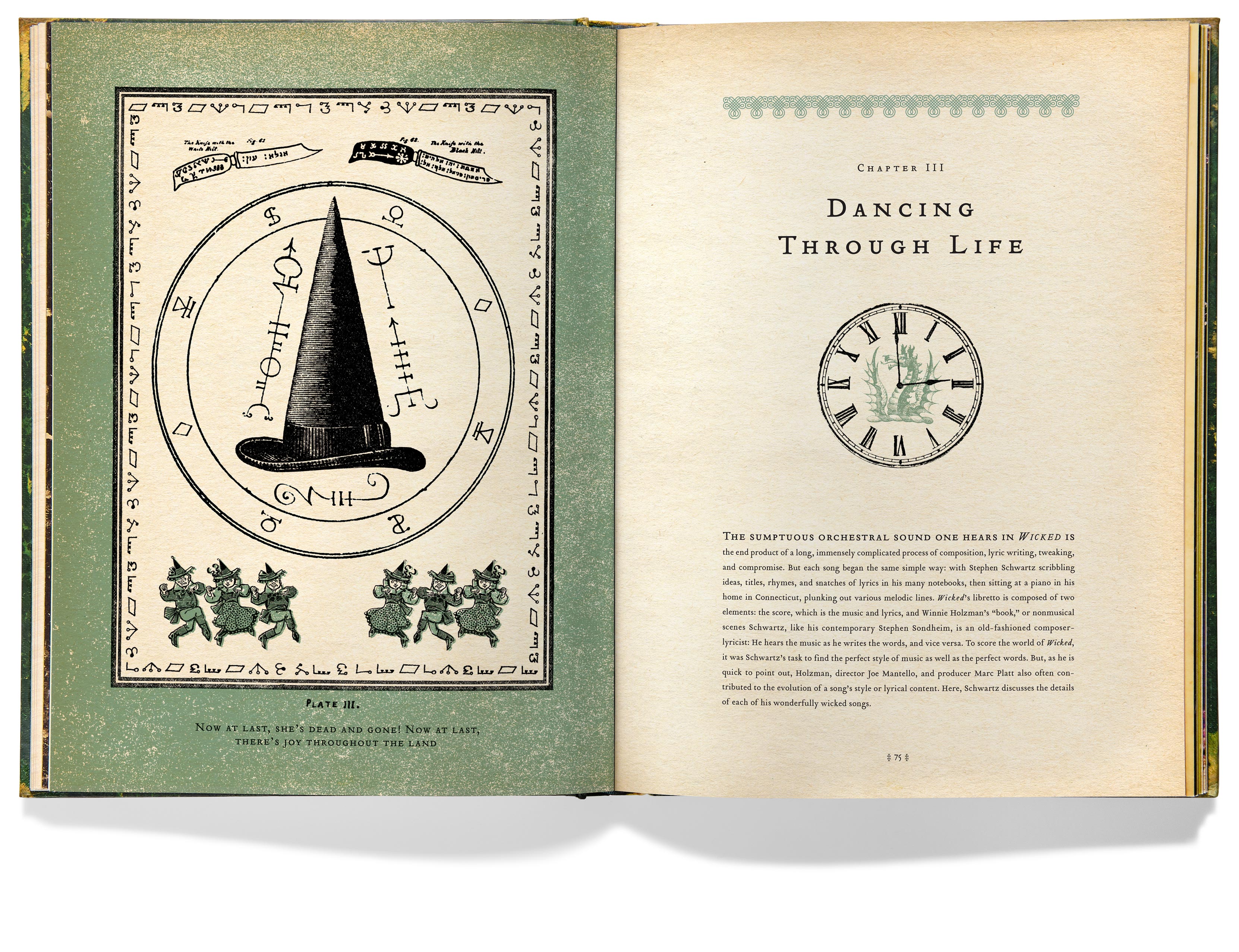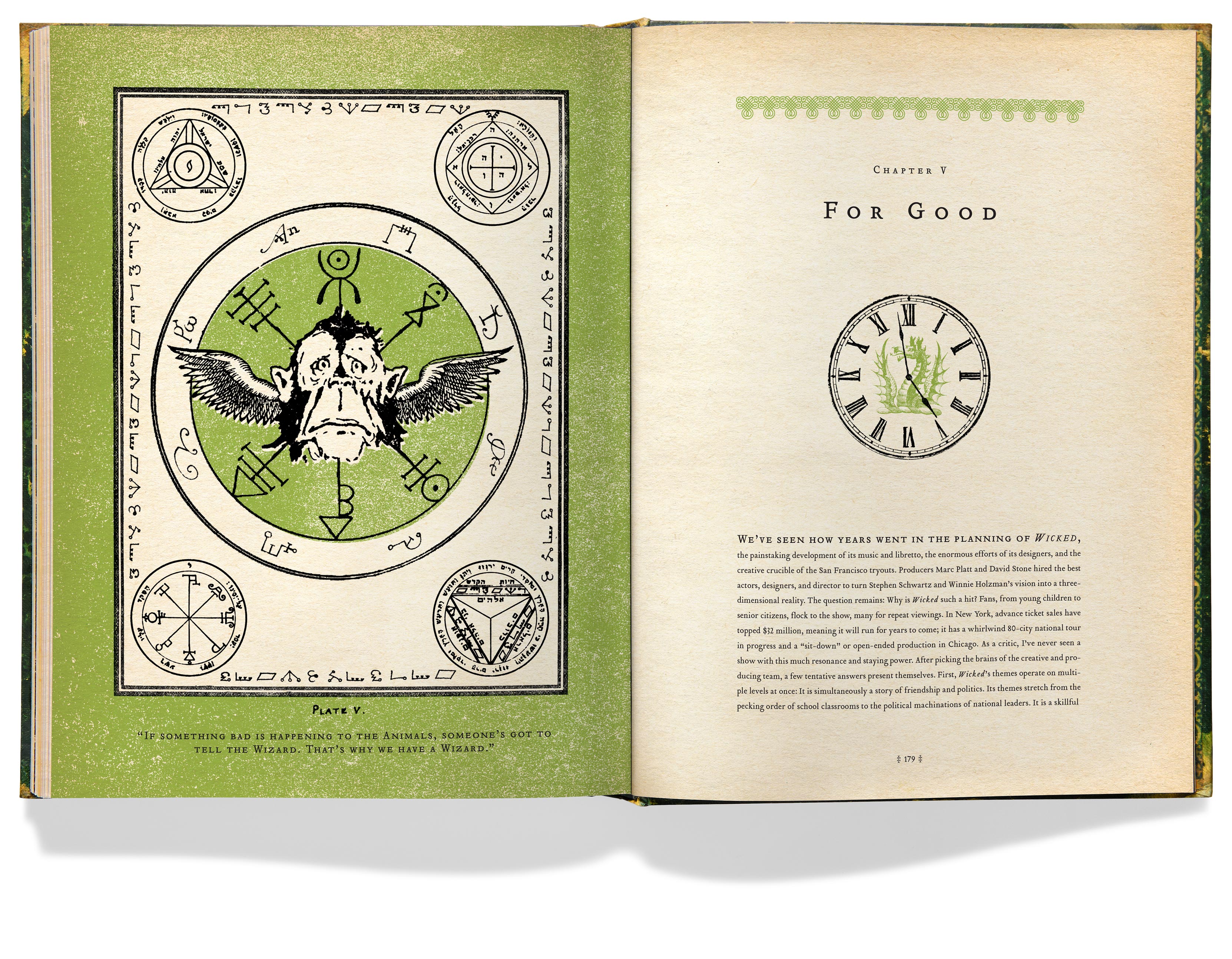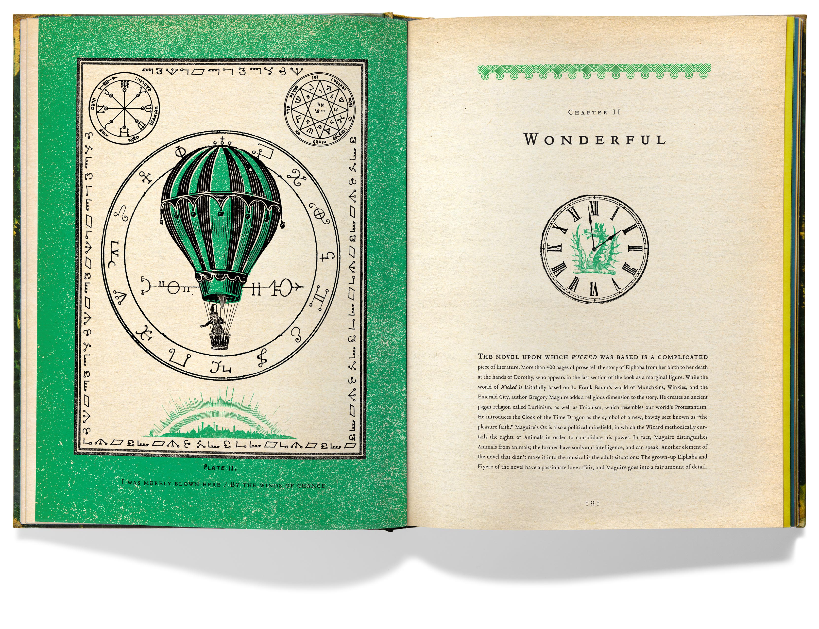 Wicked: The Grimmerie—the ultimate keepsake for fans of the Broadway sensation—is designed to look like the ancient spell book of the main character, Elphaba (the Wicked Witch of the West). To capture the whimsical yet somewhat dark tone of the play, we juxtaposed fanciful Ozian illustrations with alchemic design elements, and painstakingly aged each page of the book.