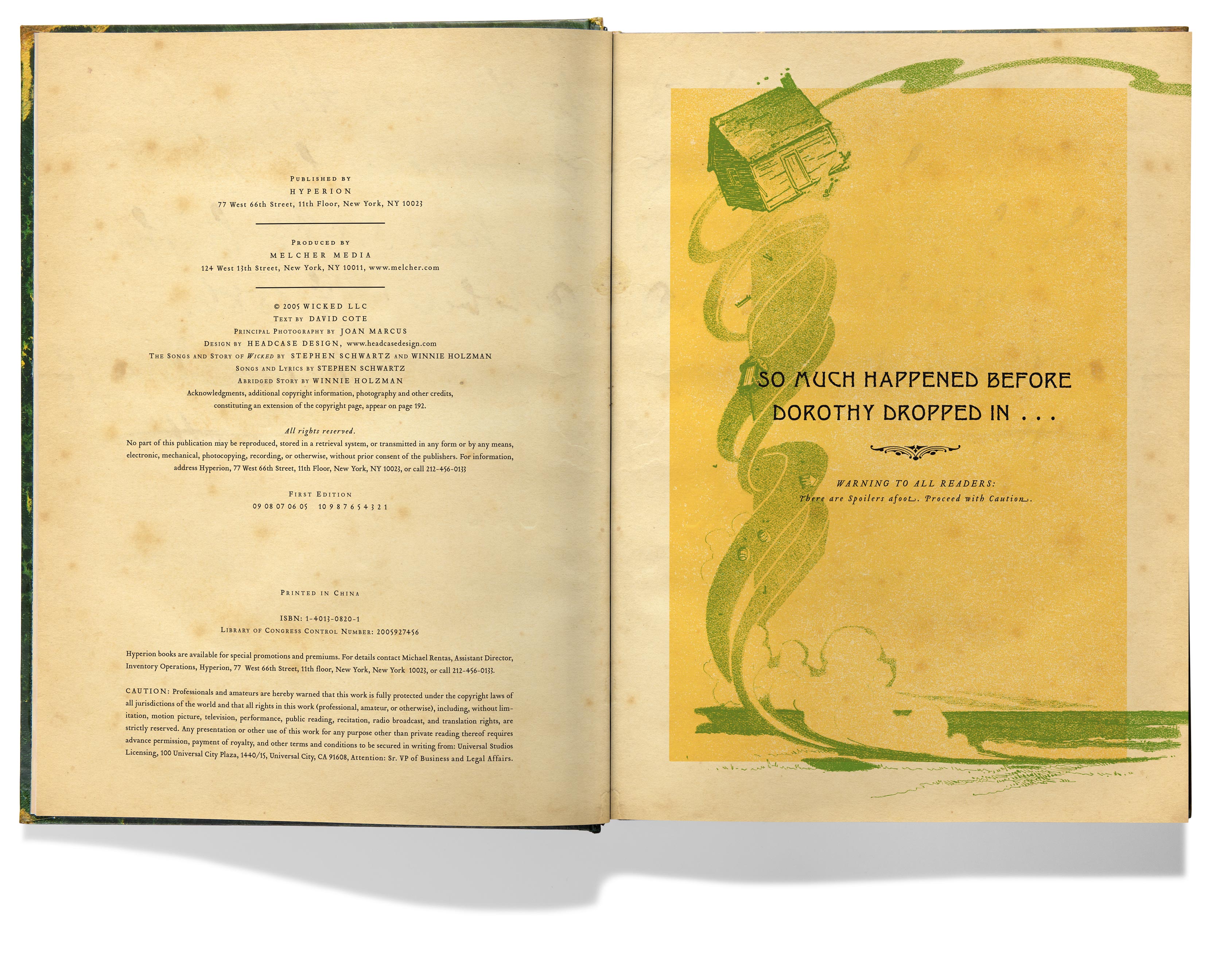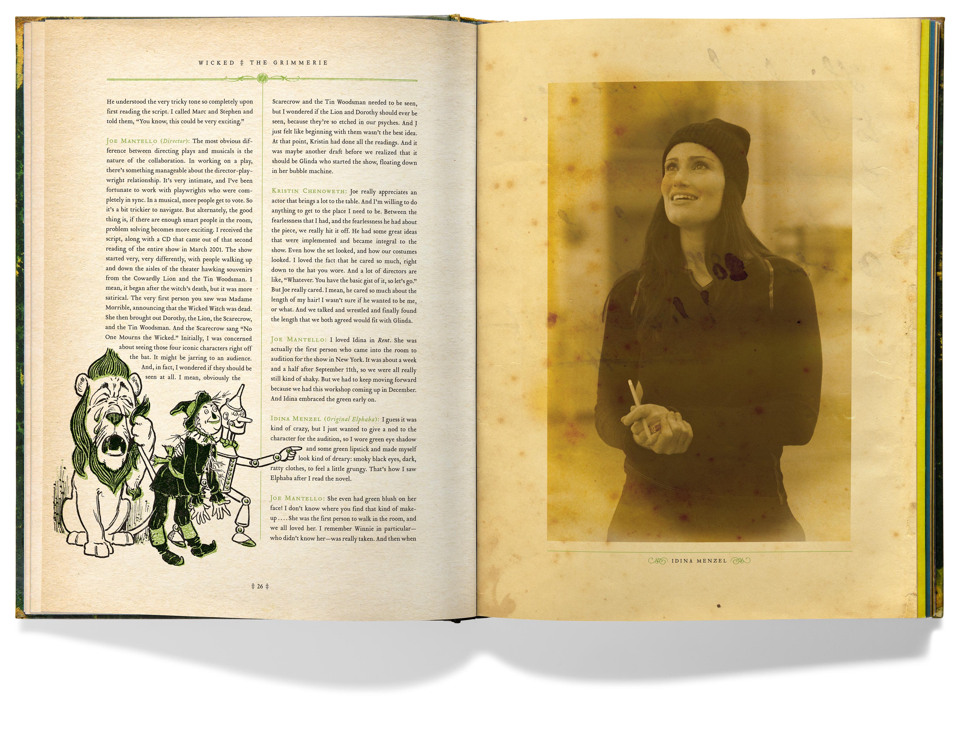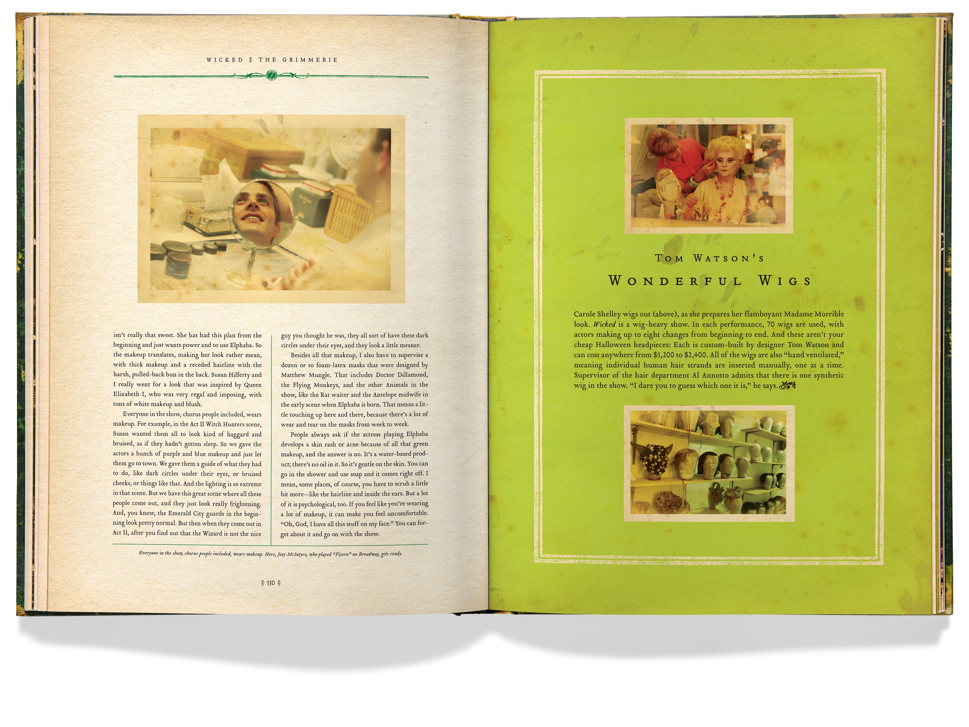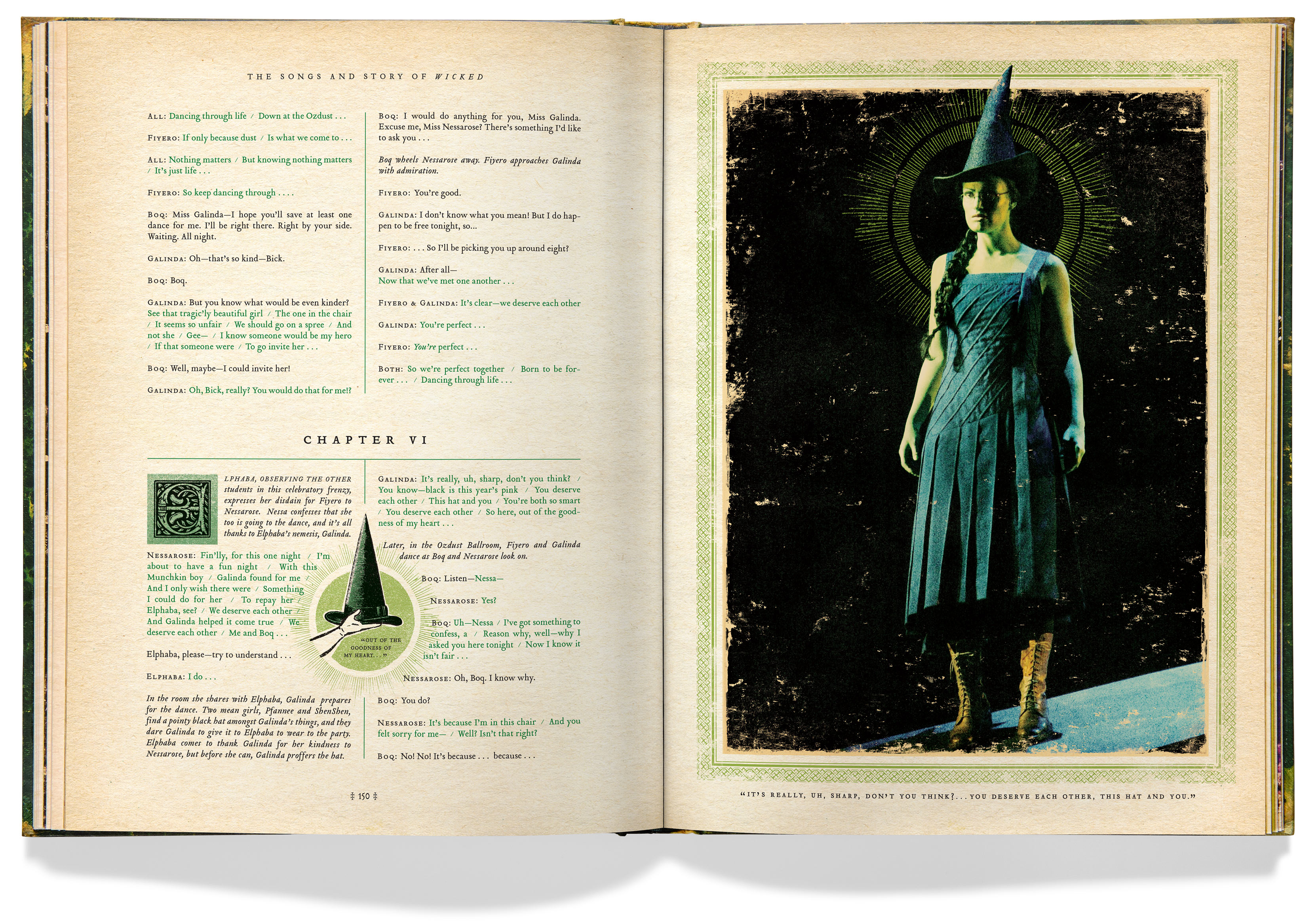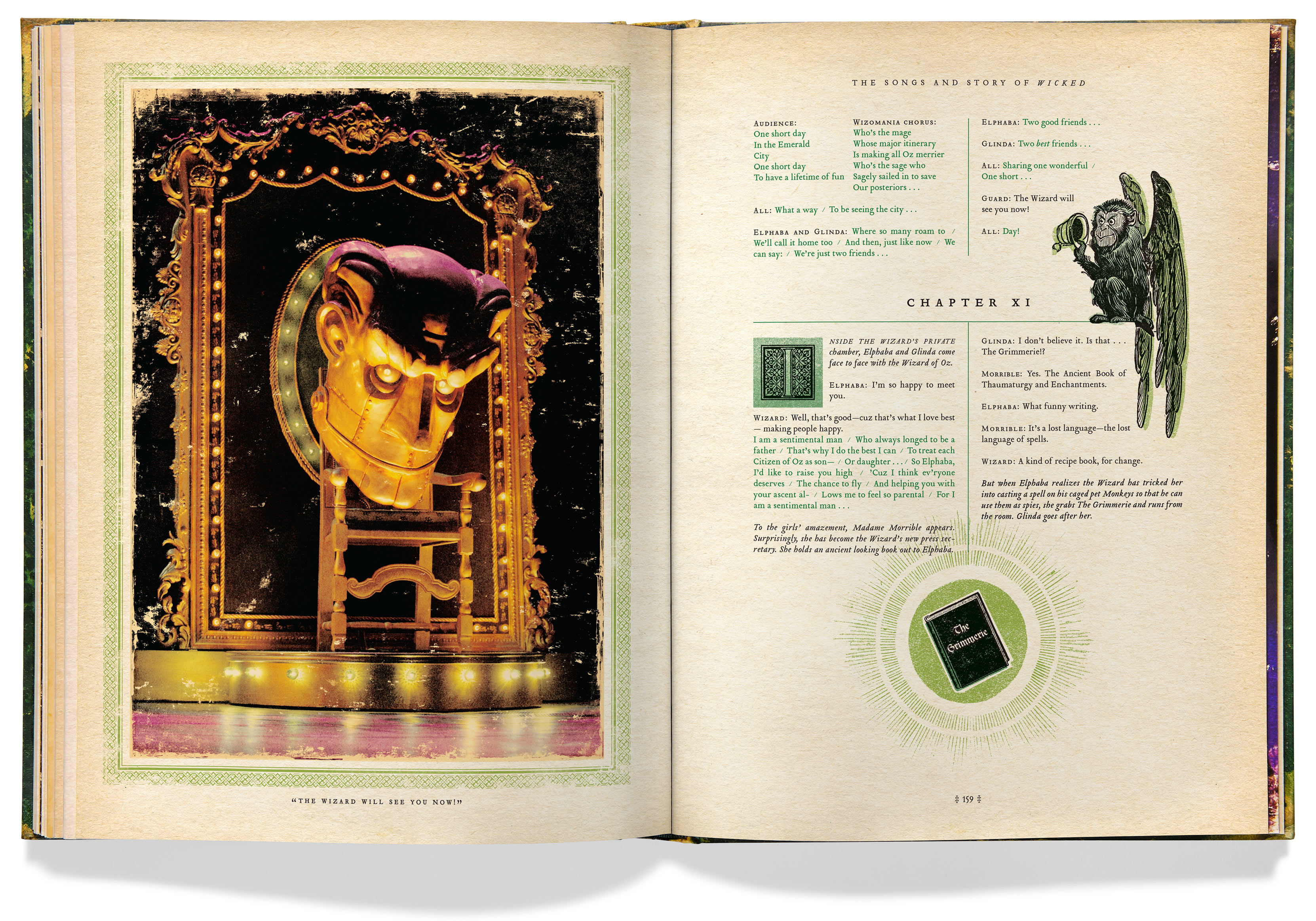 Wicked: The Grimmerie—the ultimate keepsake for fans of the Broadway sensation—is designed to look like the ancient spell book of the main character, Elphaba (the Wicked Witch of the West). To capture the whimsical yet somewhat dark tone of the play, we juxtaposed fanciful Ozian illustrations with alchemic design elements, and painstakingly aged each page of the book.