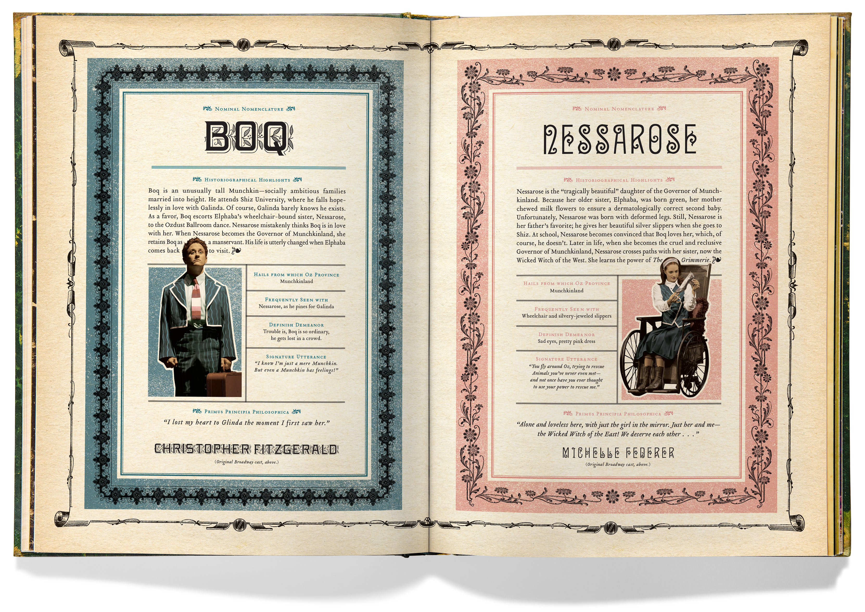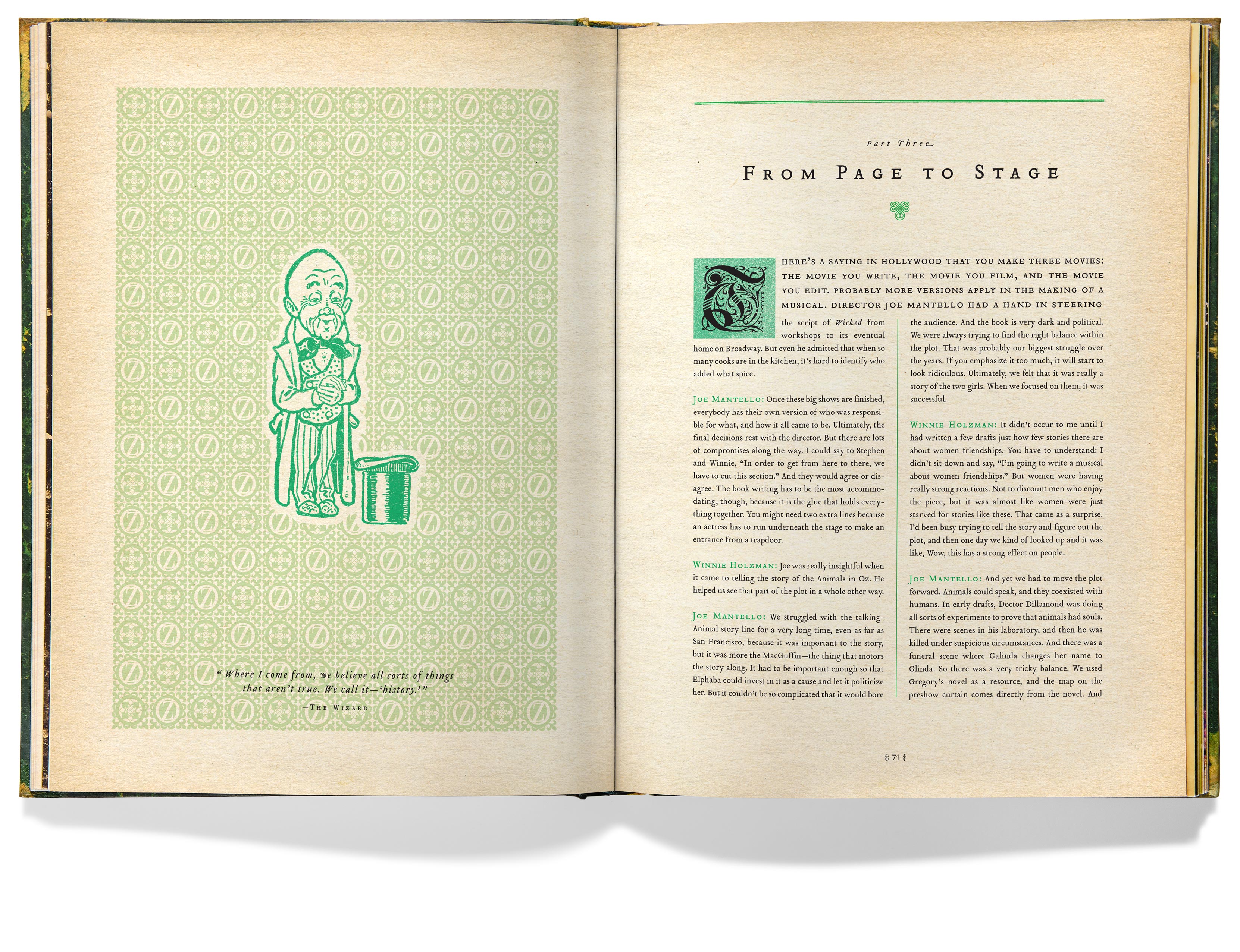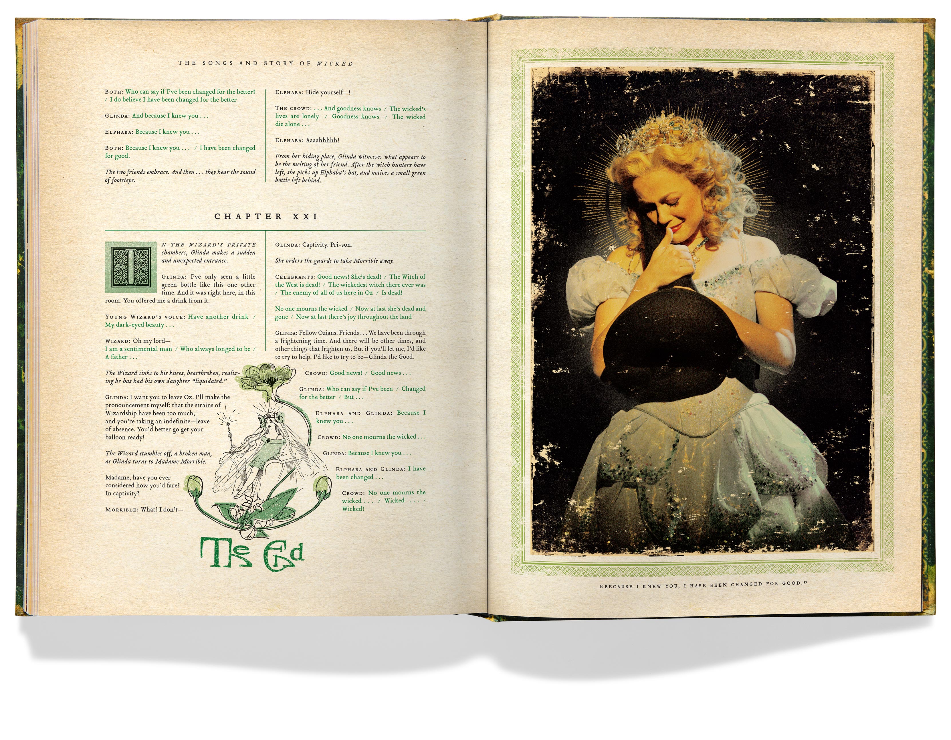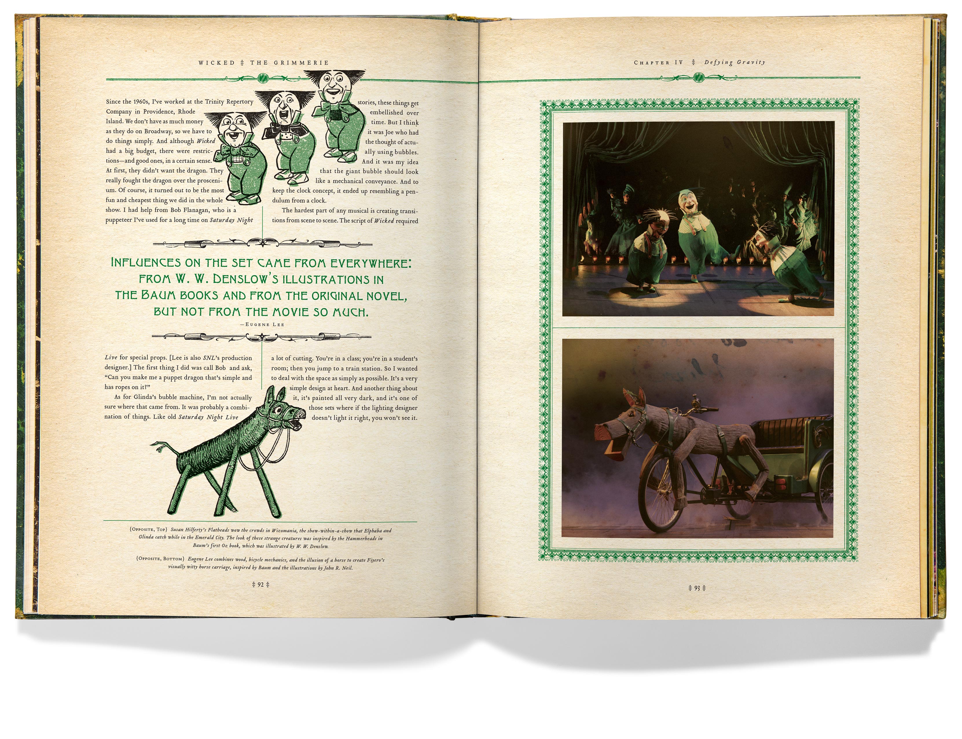 Wicked: The Grimmerie—the ultimate keepsake for fans of the Broadway sensation—is designed to look like the ancient spell book of the main character, Elphaba (the Wicked Witch of the West). To capture the whimsical yet somewhat dark tone of the play, we juxtaposed fanciful Ozian illustrations with alchemic design elements, and painstakingly aged each page of the book.