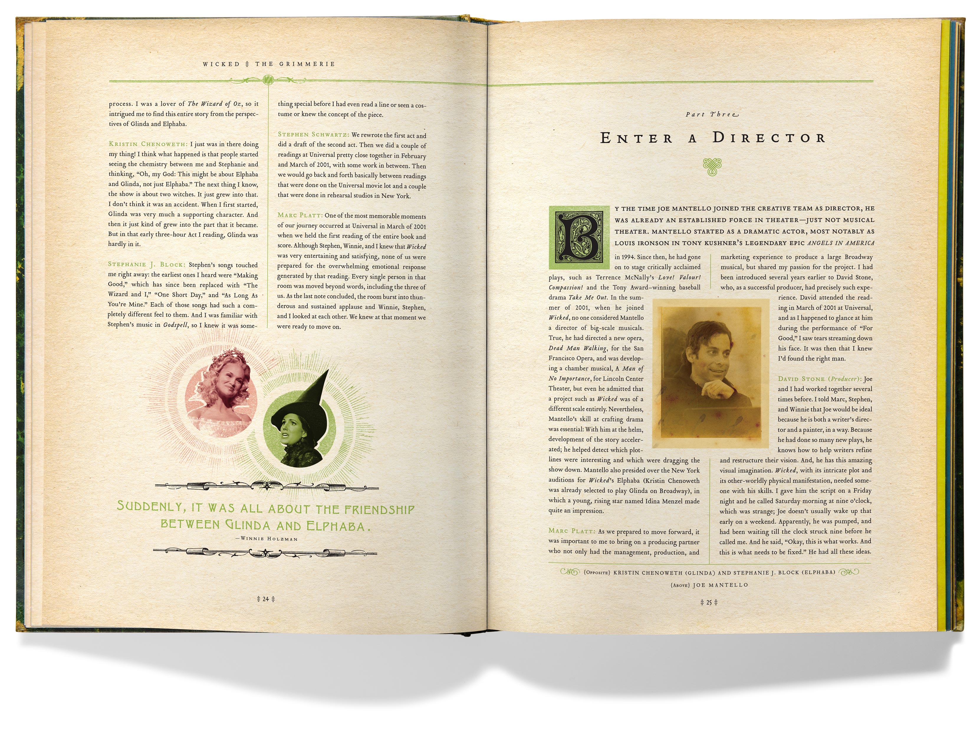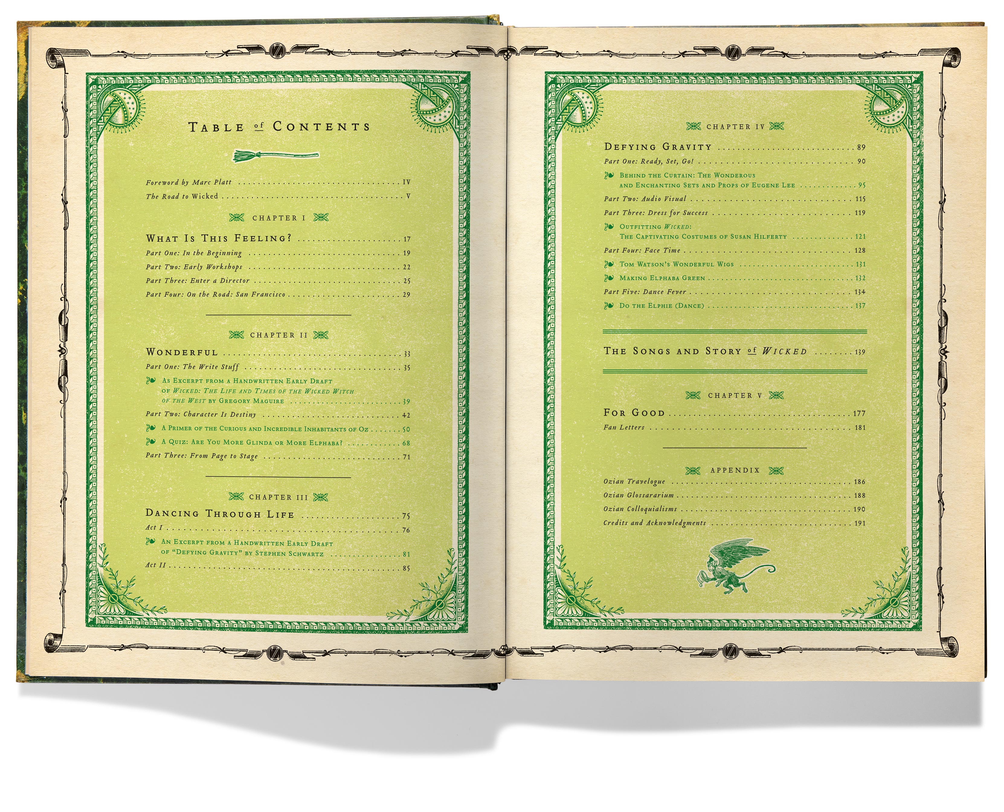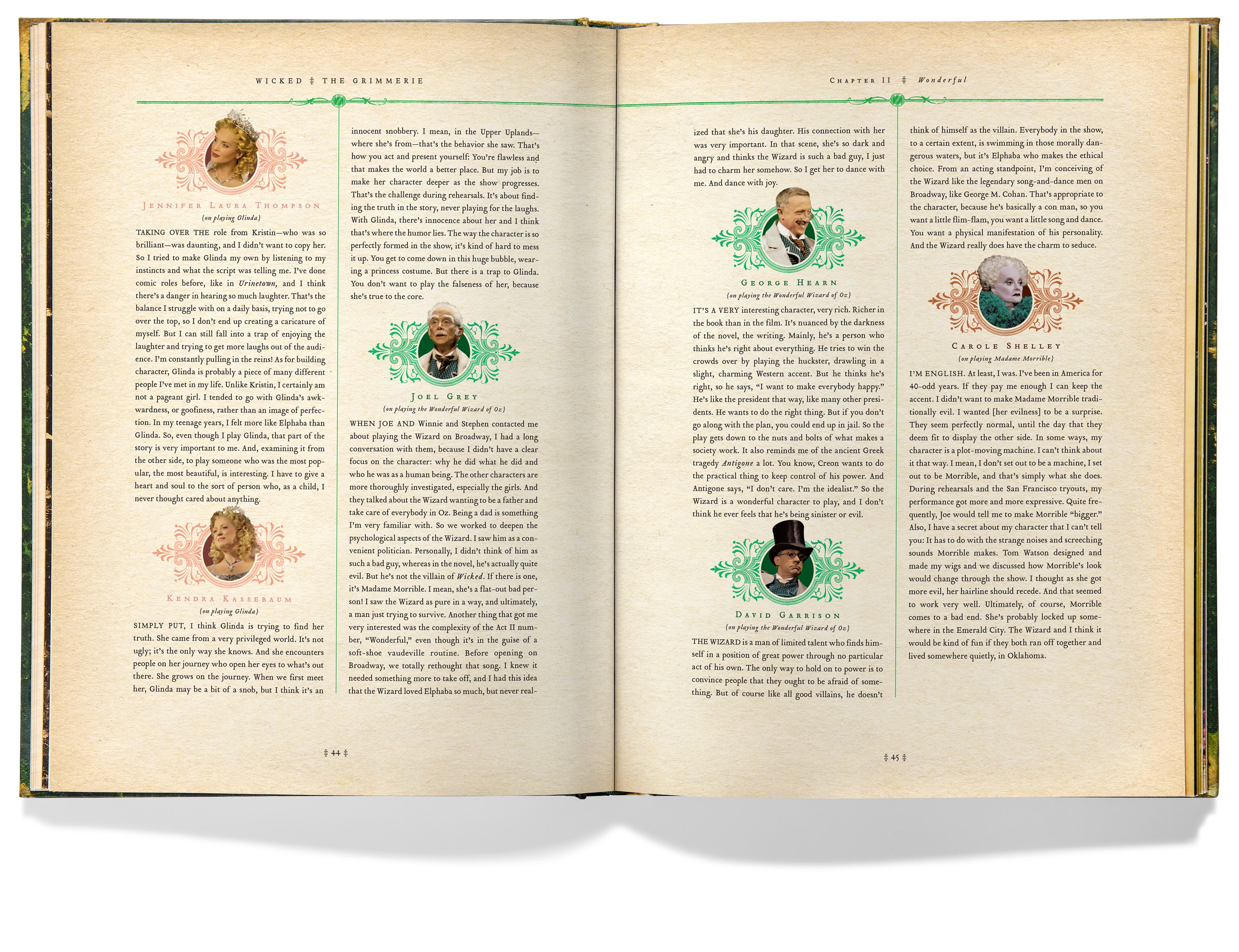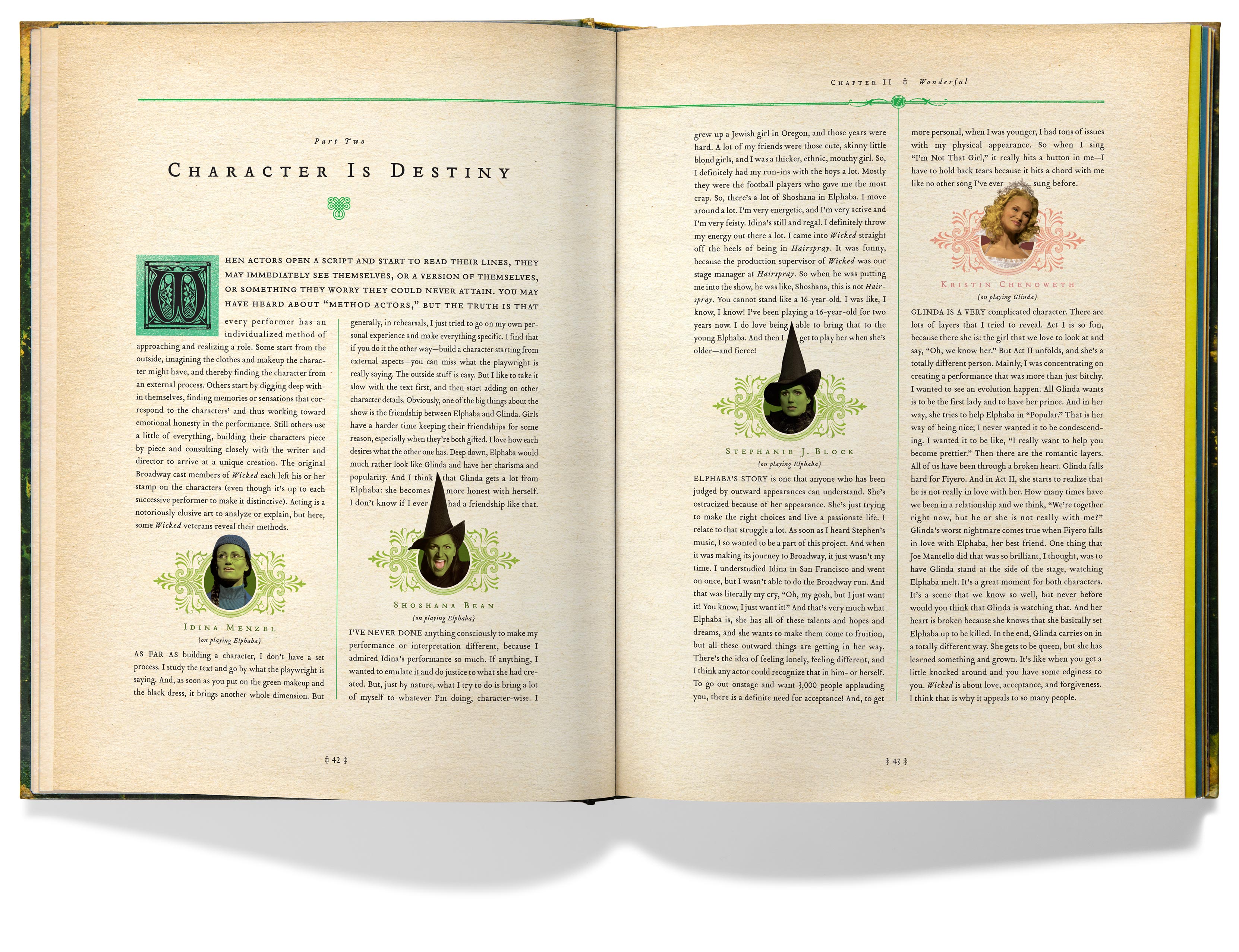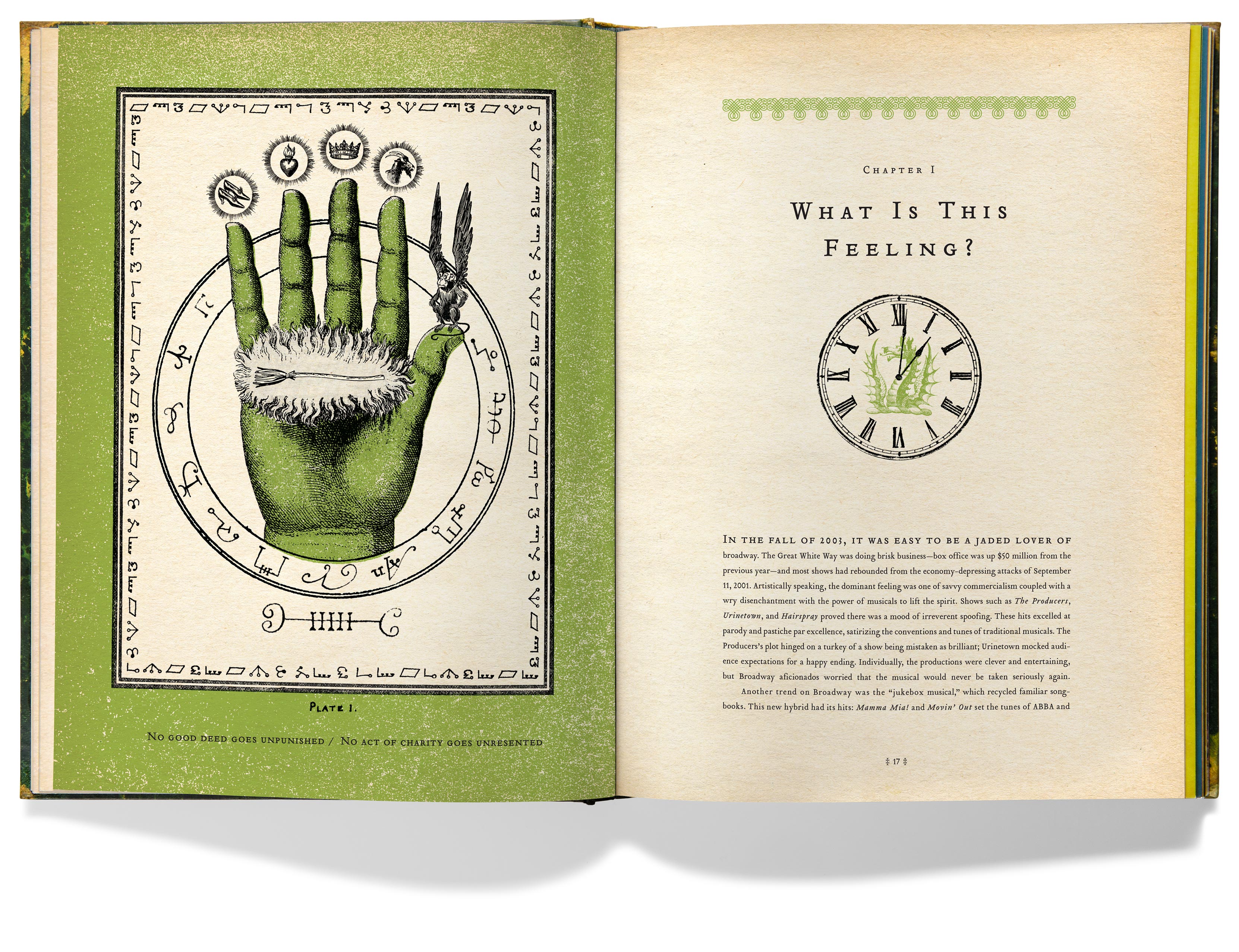 Wicked: The Grimmerie—the ultimate keepsake for fans of the Broadway sensation—is designed to look like the ancient spell book of the main character, Elphaba (the Wicked Witch of the West). To capture the whimsical yet somewhat dark tone of the play, we juxtaposed fanciful Ozian illustrations with alchemic design elements, and painstakingly aged each page of the book.