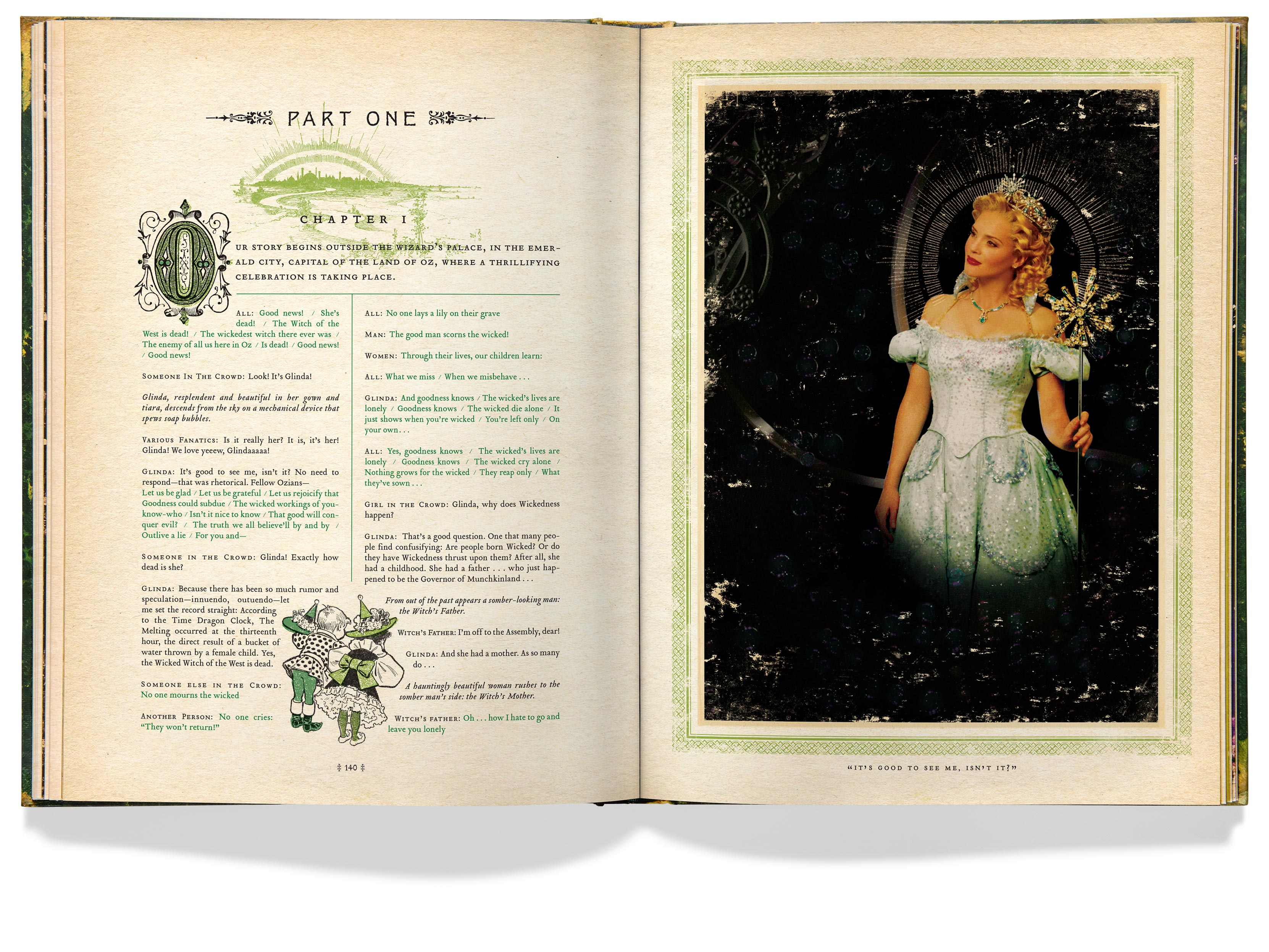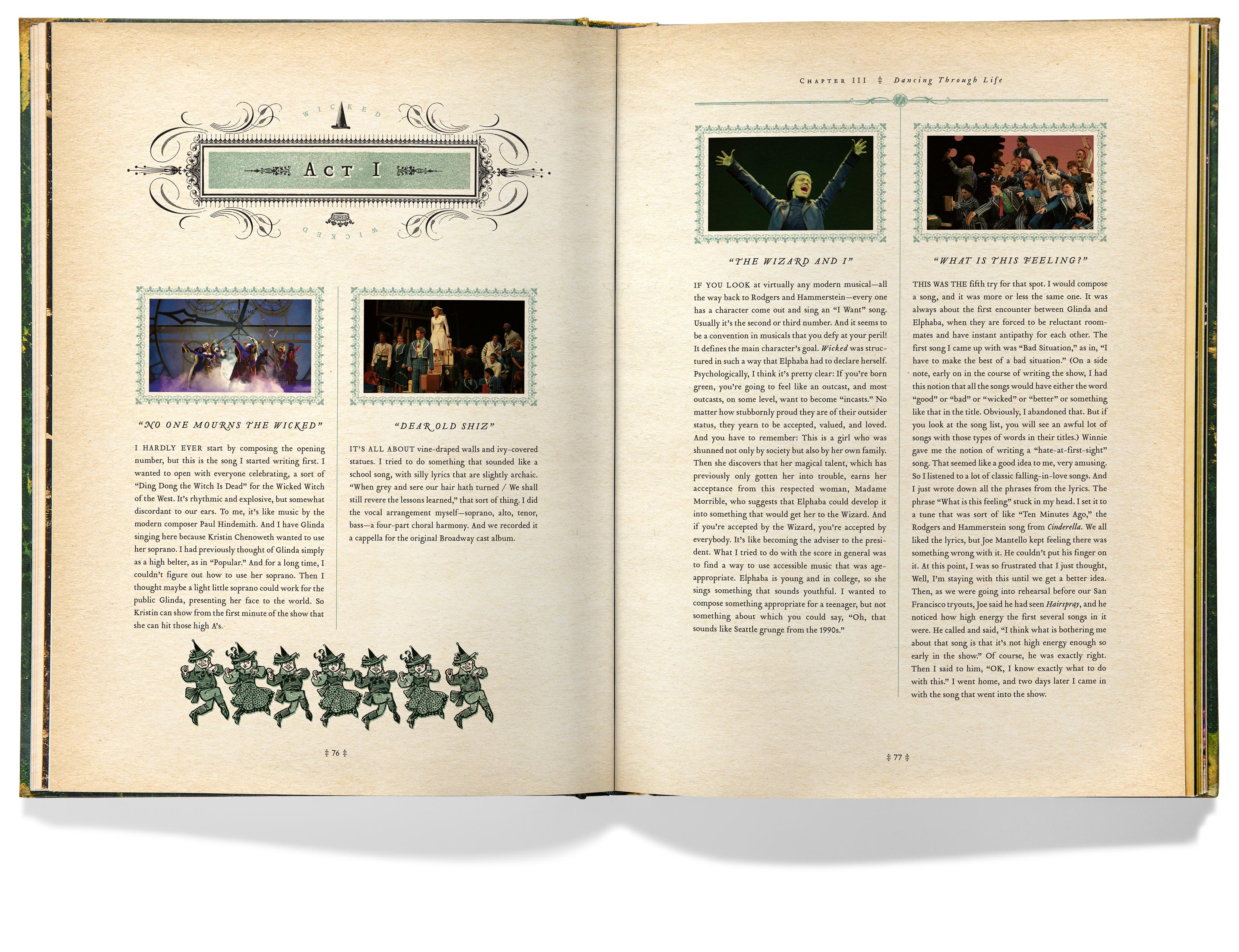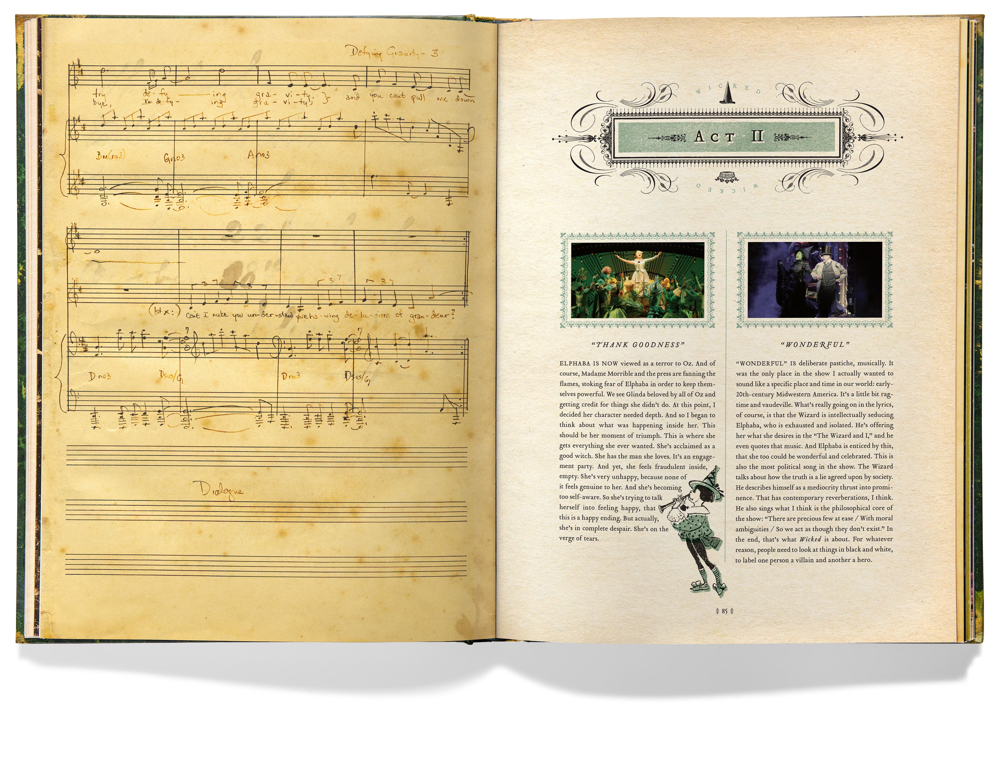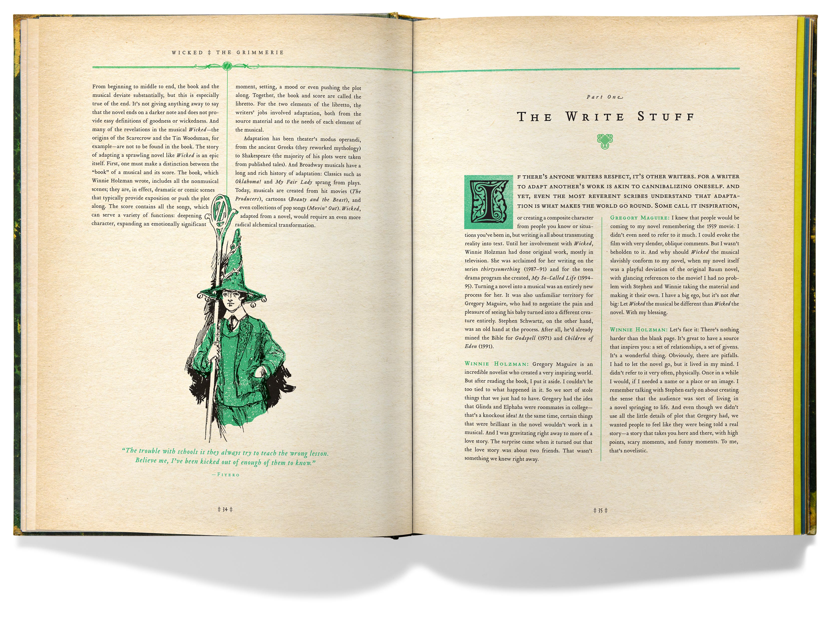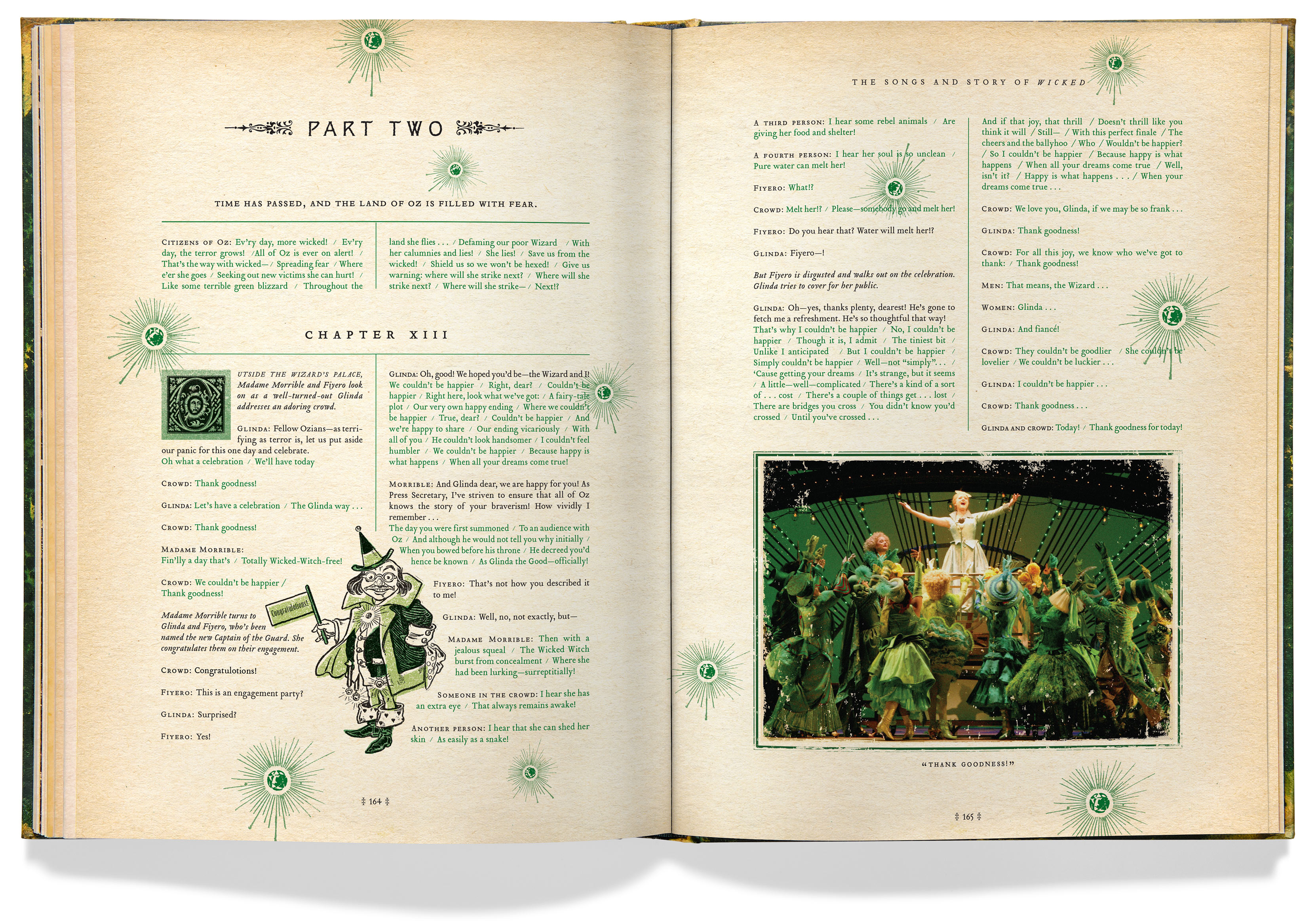 Wicked: The Grimmerie—the ultimate keepsake for fans of the Broadway sensation—is designed to look like the ancient spell book of the main character, Elphaba (the Wicked Witch of the West). To capture the whimsical yet somewhat dark tone of the play, we juxtaposed fanciful Ozian illustrations with alchemic design elements, and painstakingly aged each page of the book.