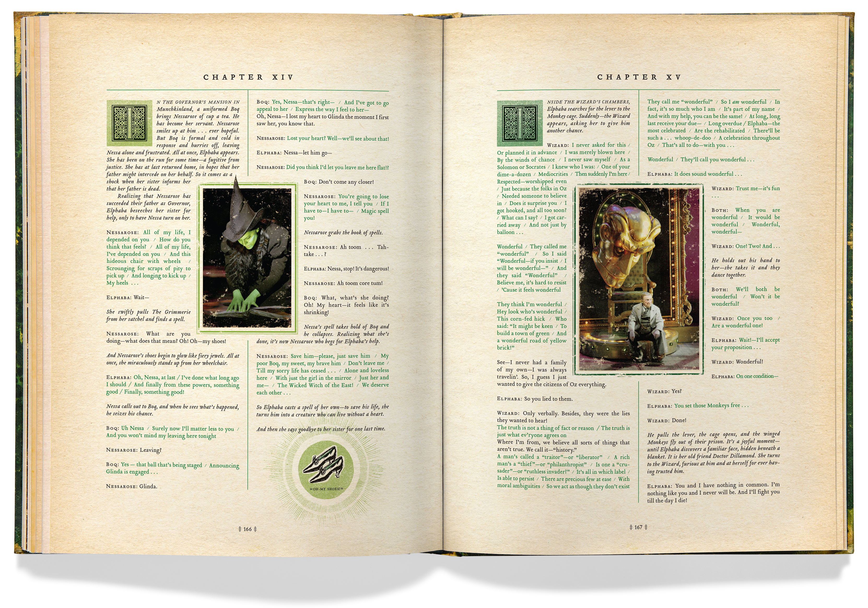 Art from the original Oz book series was appropriated (with permission) in the layouts and layered on the stage photos to add to the storybook feel of the libretto, as well as illustrate parts of the story for which we didn’t have photography.